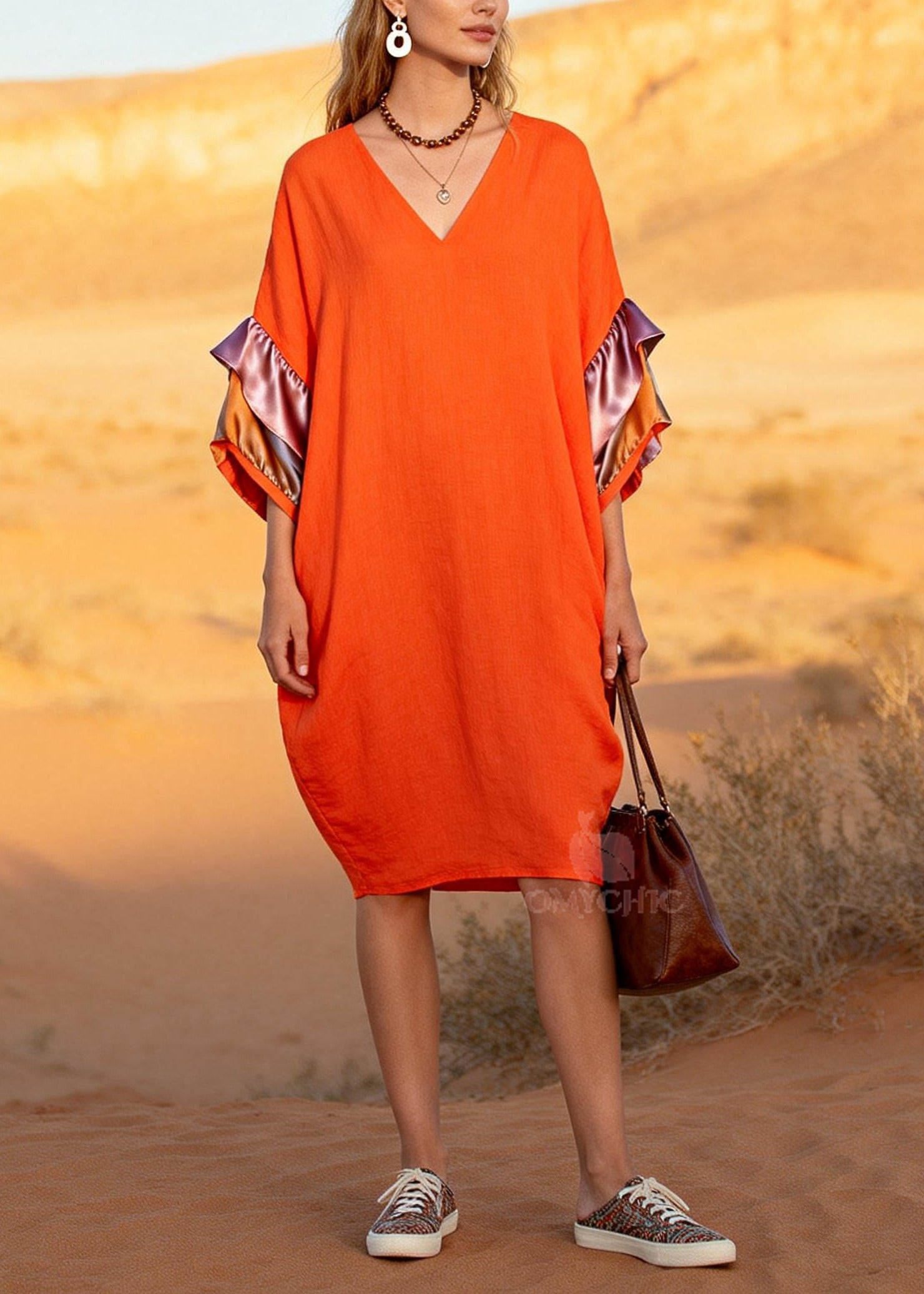 Plus Size Orange V Neck Patchwork Cotton Mid Dress Butterfly Sleeve