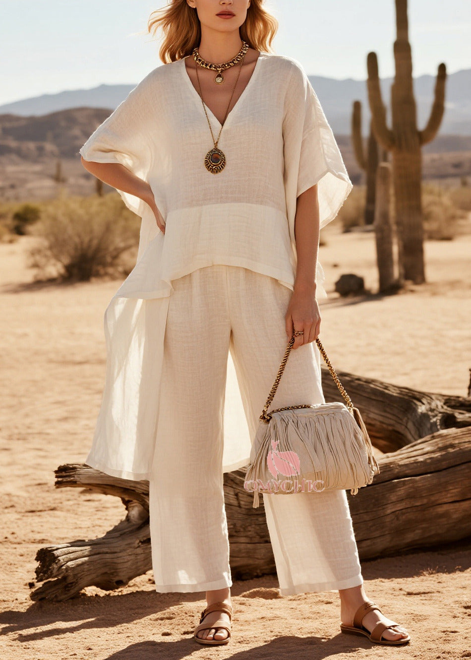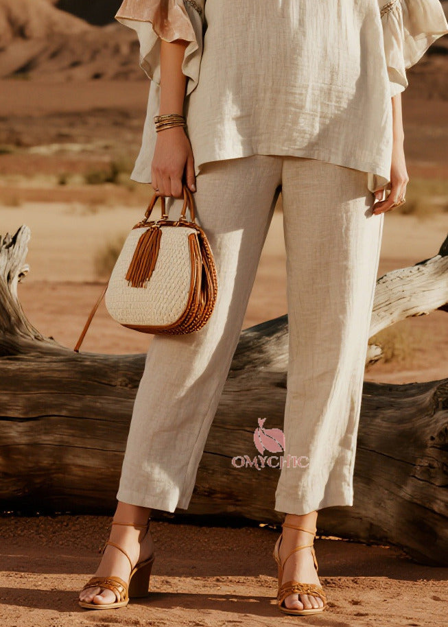Simple Beige V Neck Patchwork Linen Two Pieces Set Butterfly Sleeve