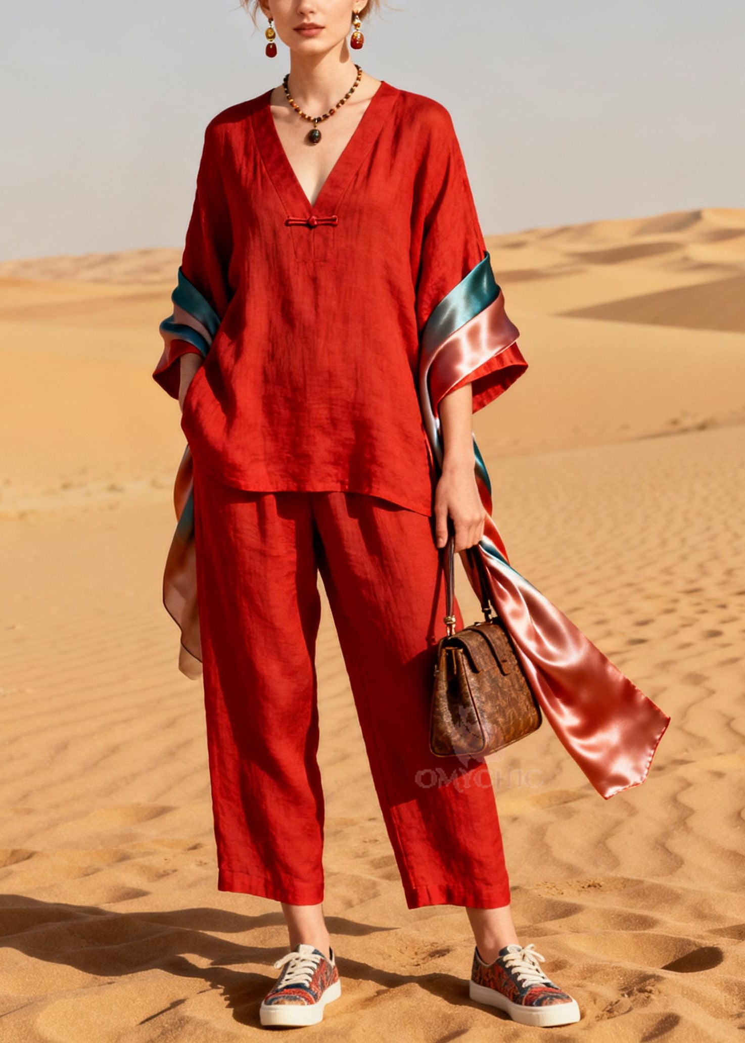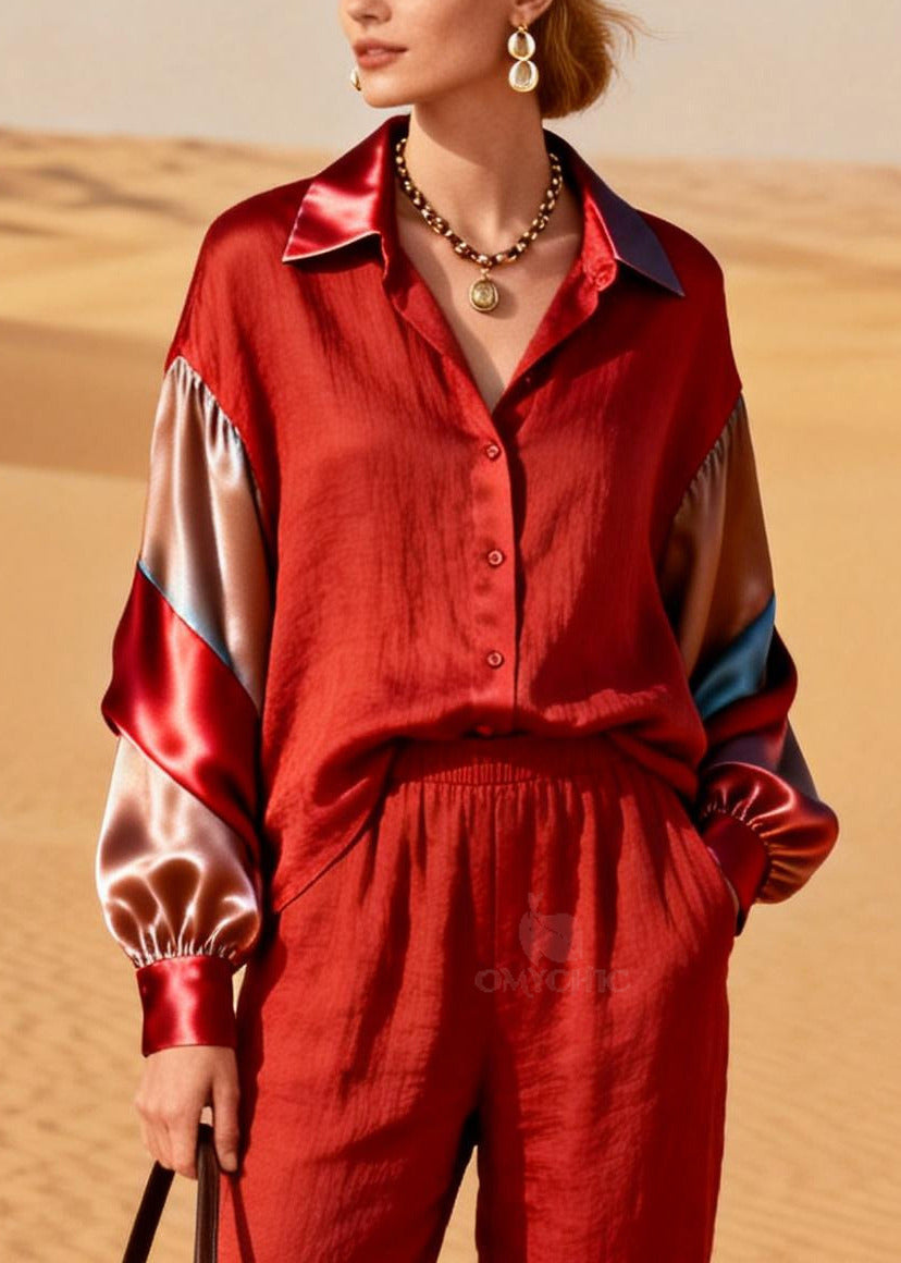 Chic Red V Neck Patchwork Shawl Chinese Button Cotton Two Pieces Set Spring
