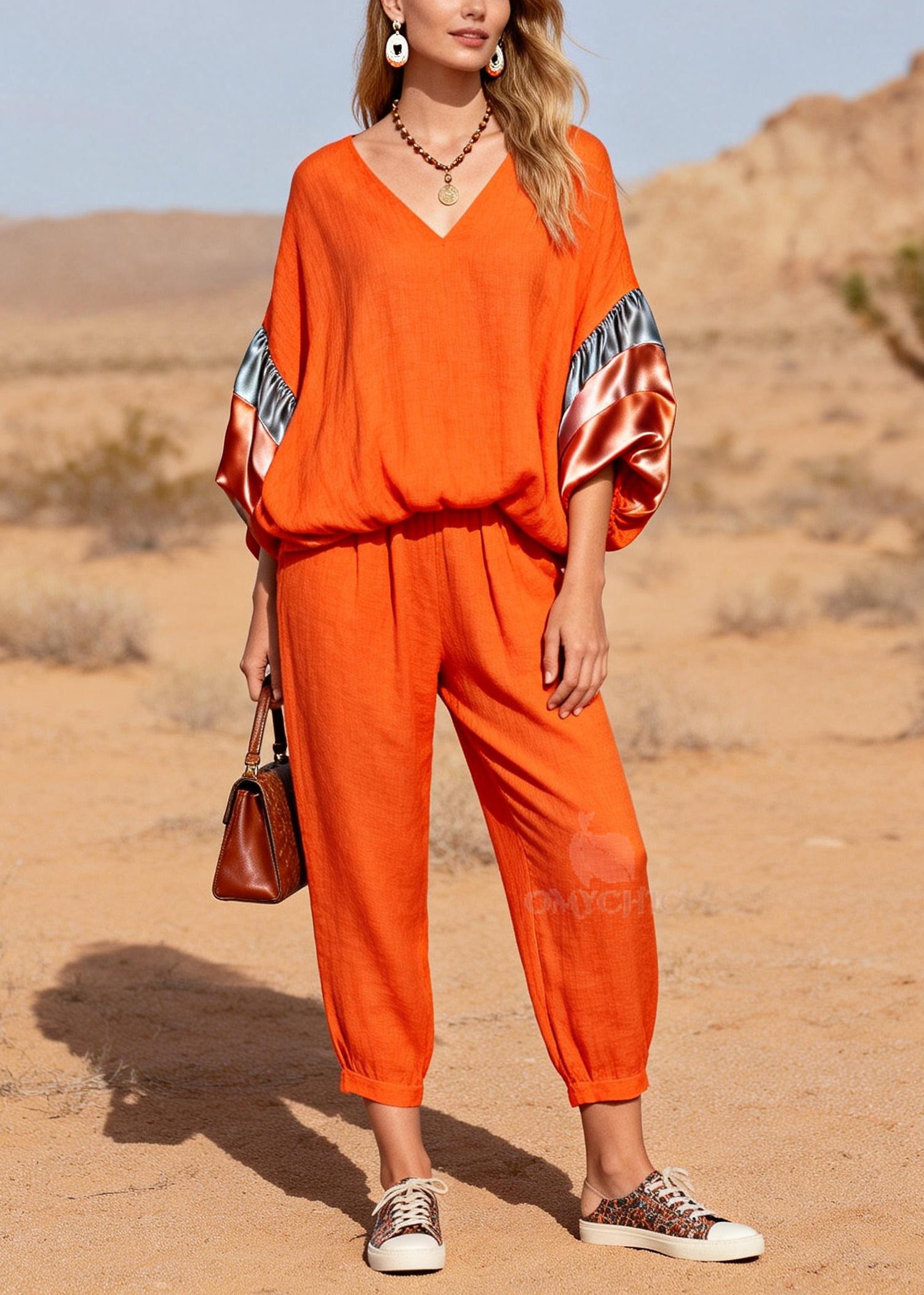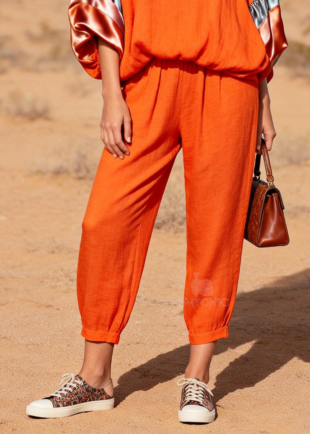 Modern Orange Oversized Patchwork Cotton Two Pieces Set Spring