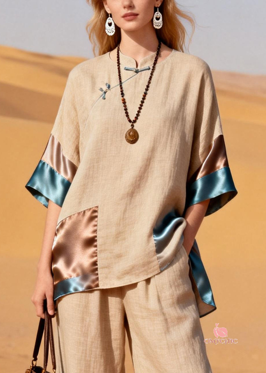 New Khaki Stand Collar Chinese Button Patchwork Silk Linen Two Pieces Set Half Sleeve