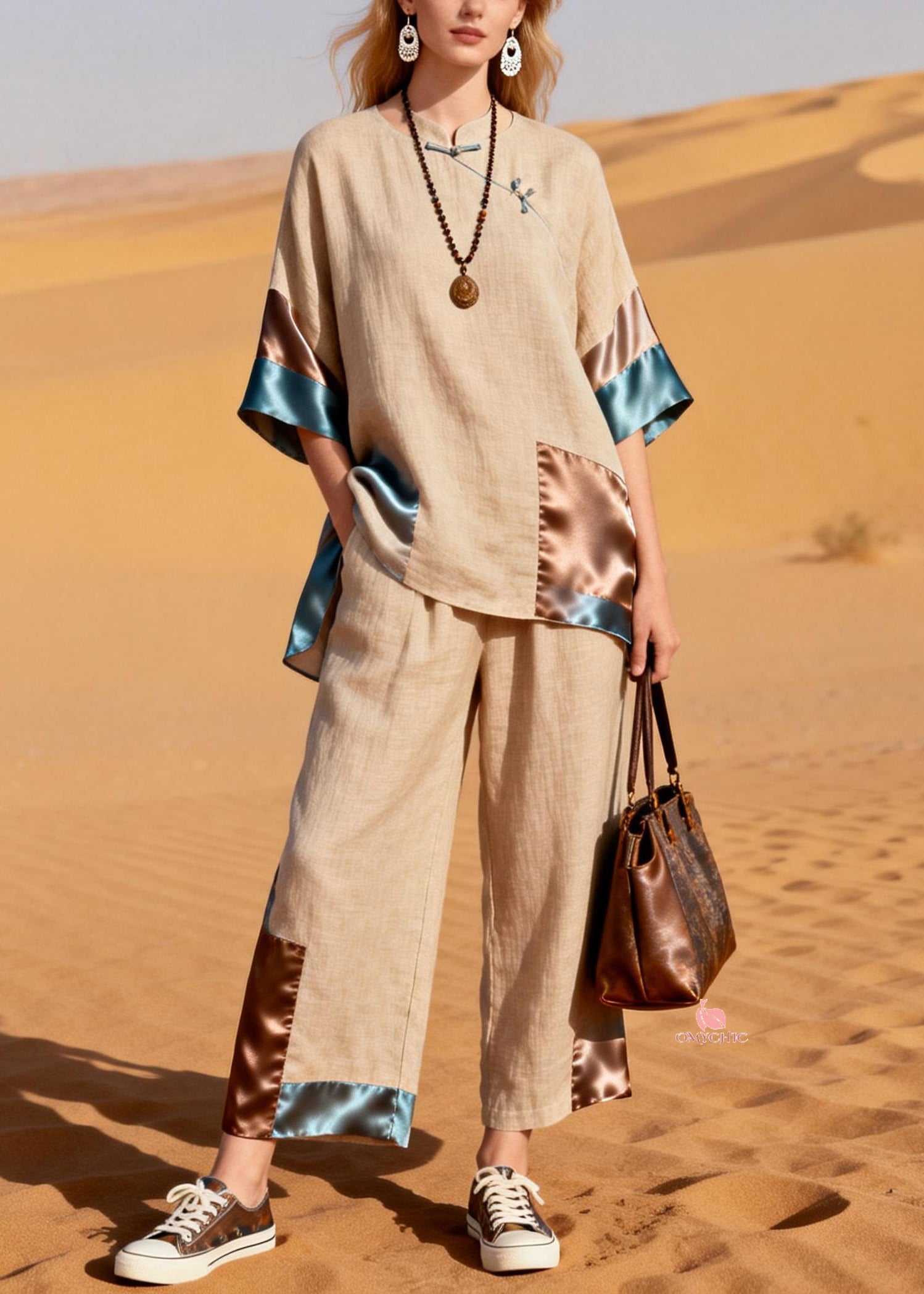 Natural Khaki Oversized Patchwork Silk Linen Two Piece Set Outfits Summer