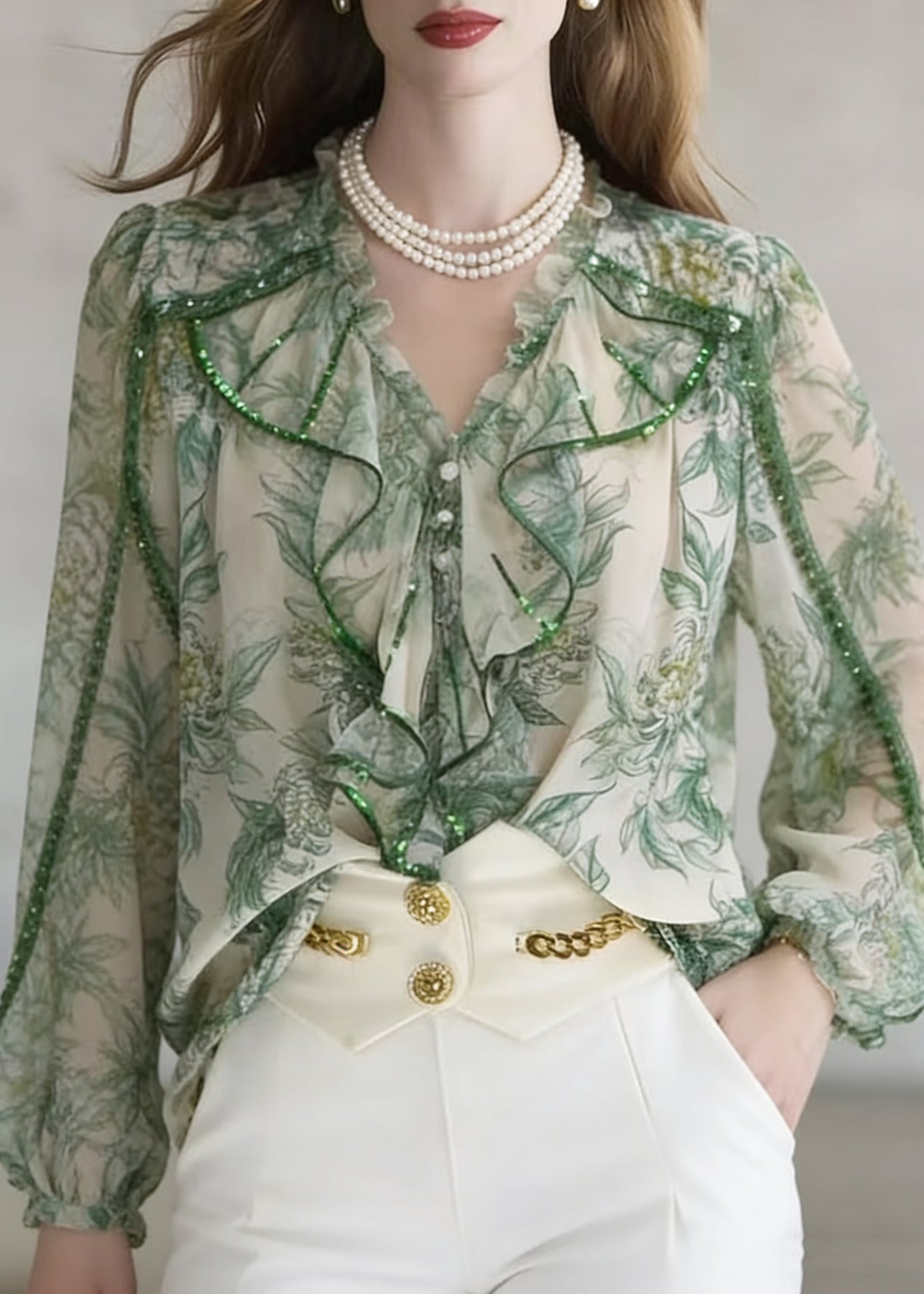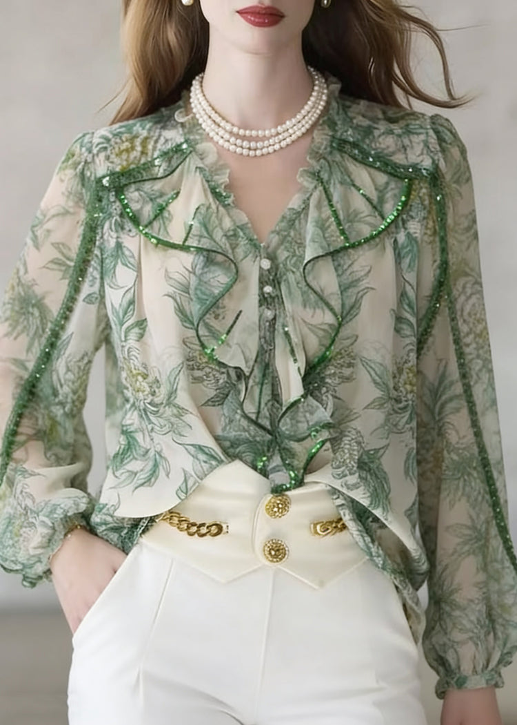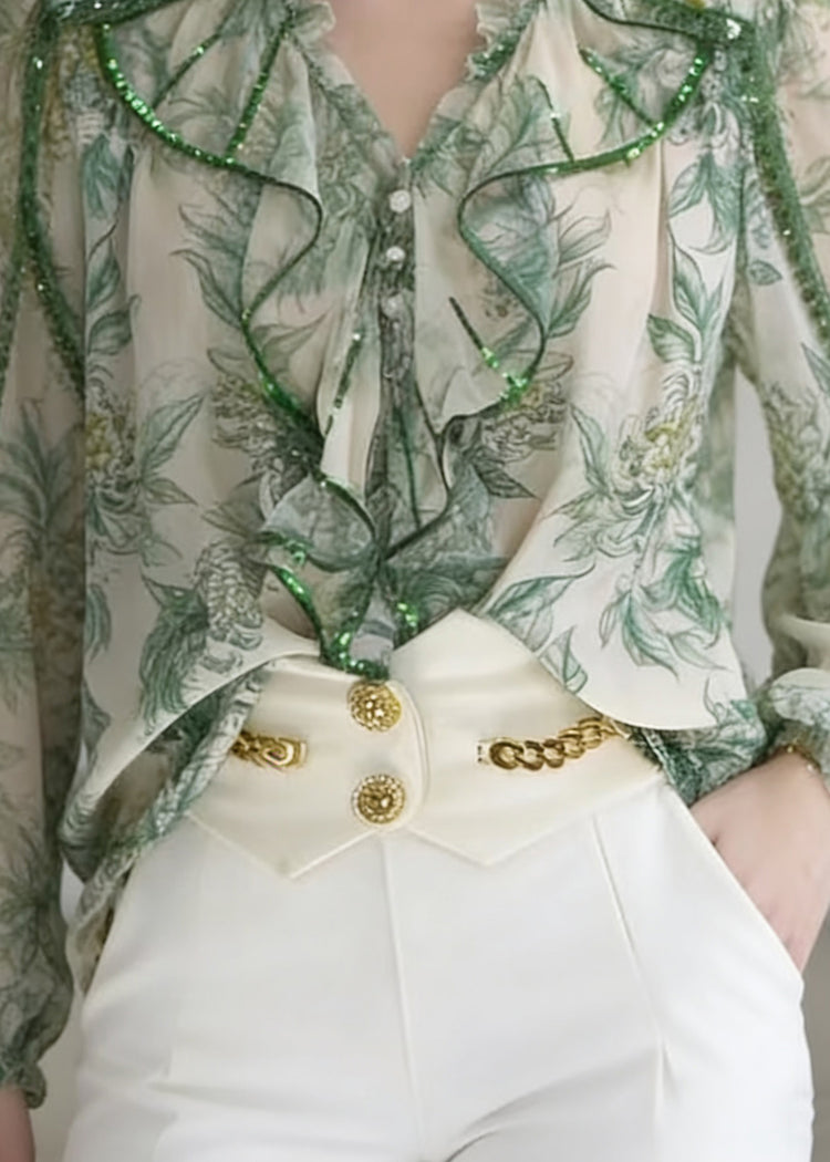 Stylish Green Ruffled Print Patchwork Chiffon Blouse Spring