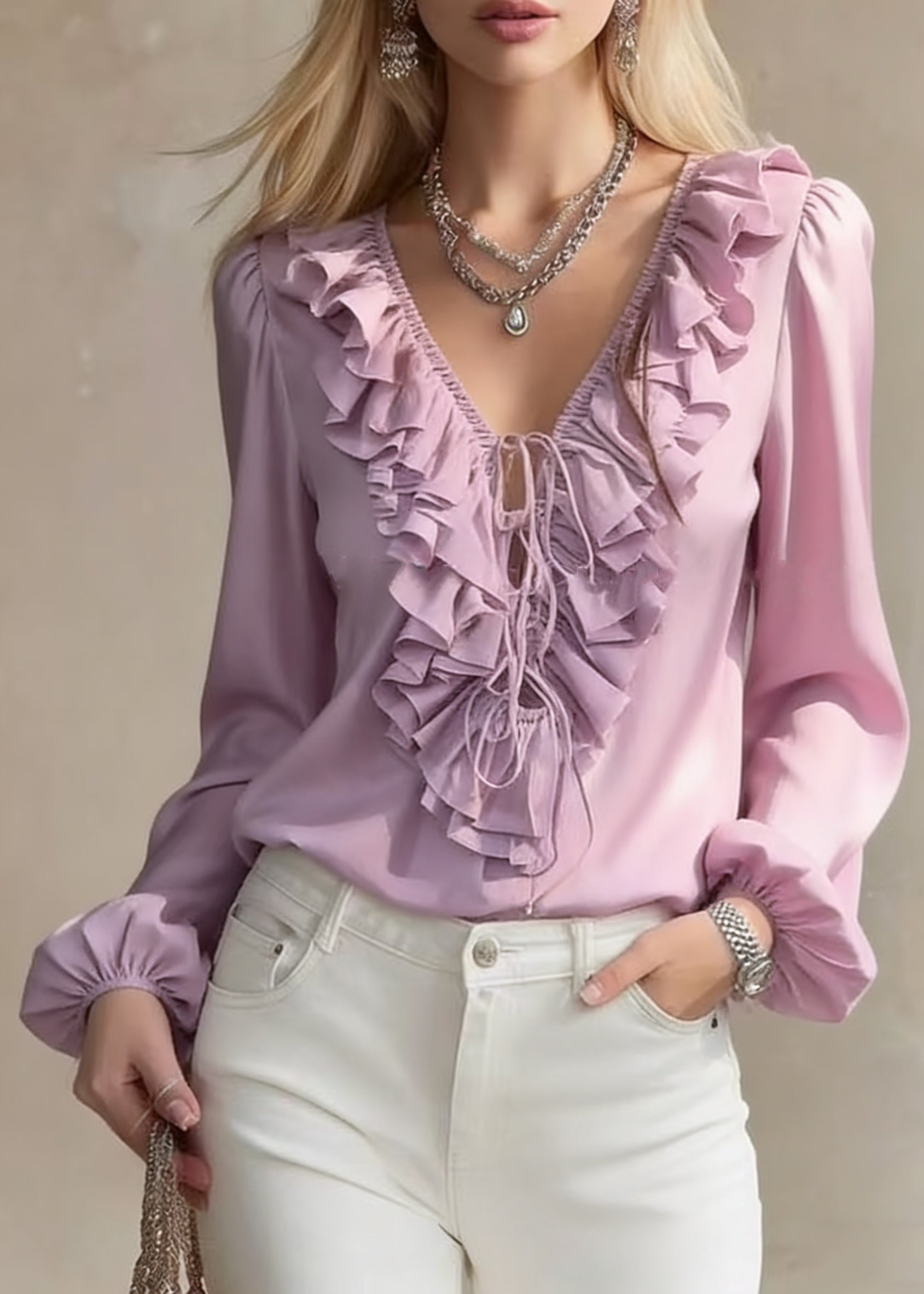 Purple Ruffled Lace Up Chiffon Blouses V Neck Lantern Sleeve