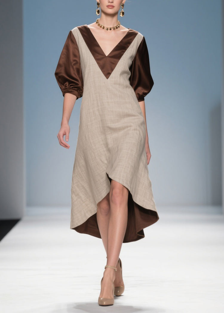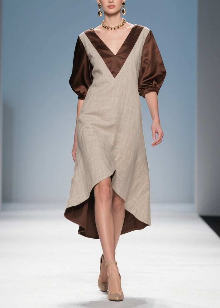 Beautiful Colorblock Low High Design Patchwork Linen Silk Dress Summer