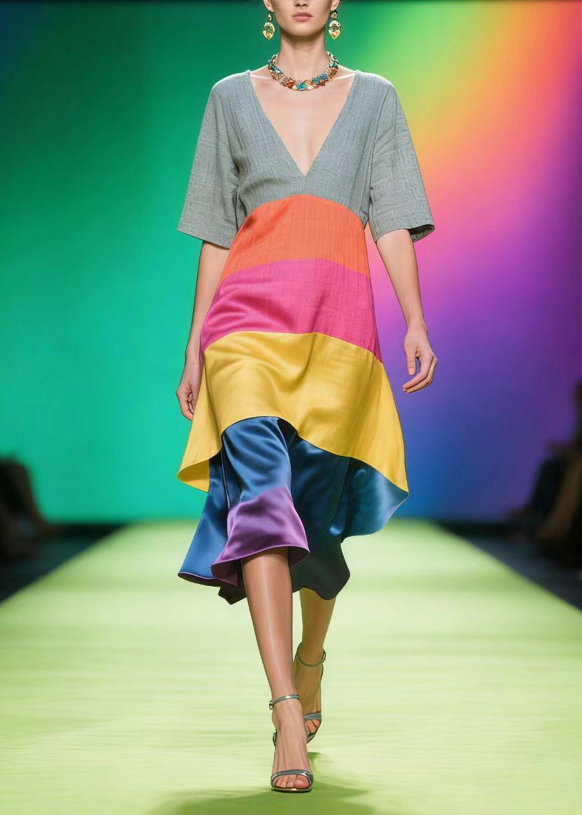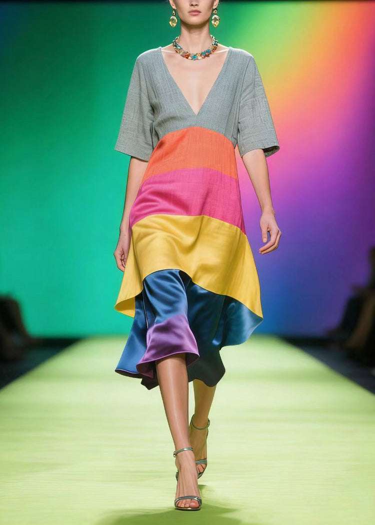 Boho Colorblock V Neck Patchwork Linen Silk Dress Summer