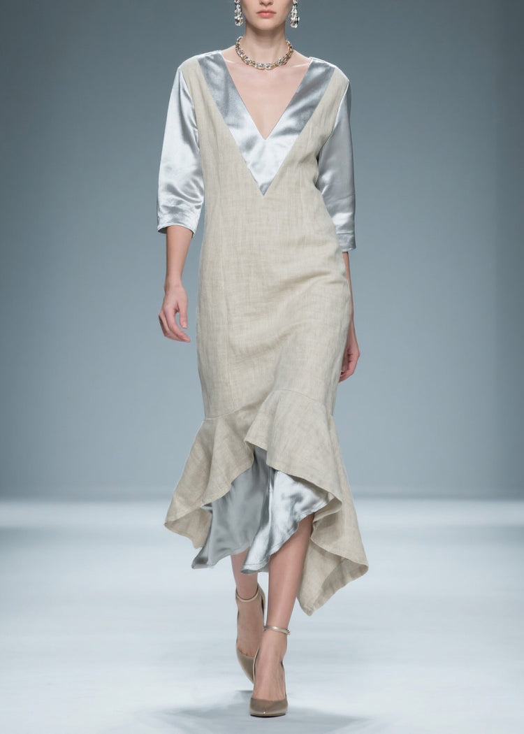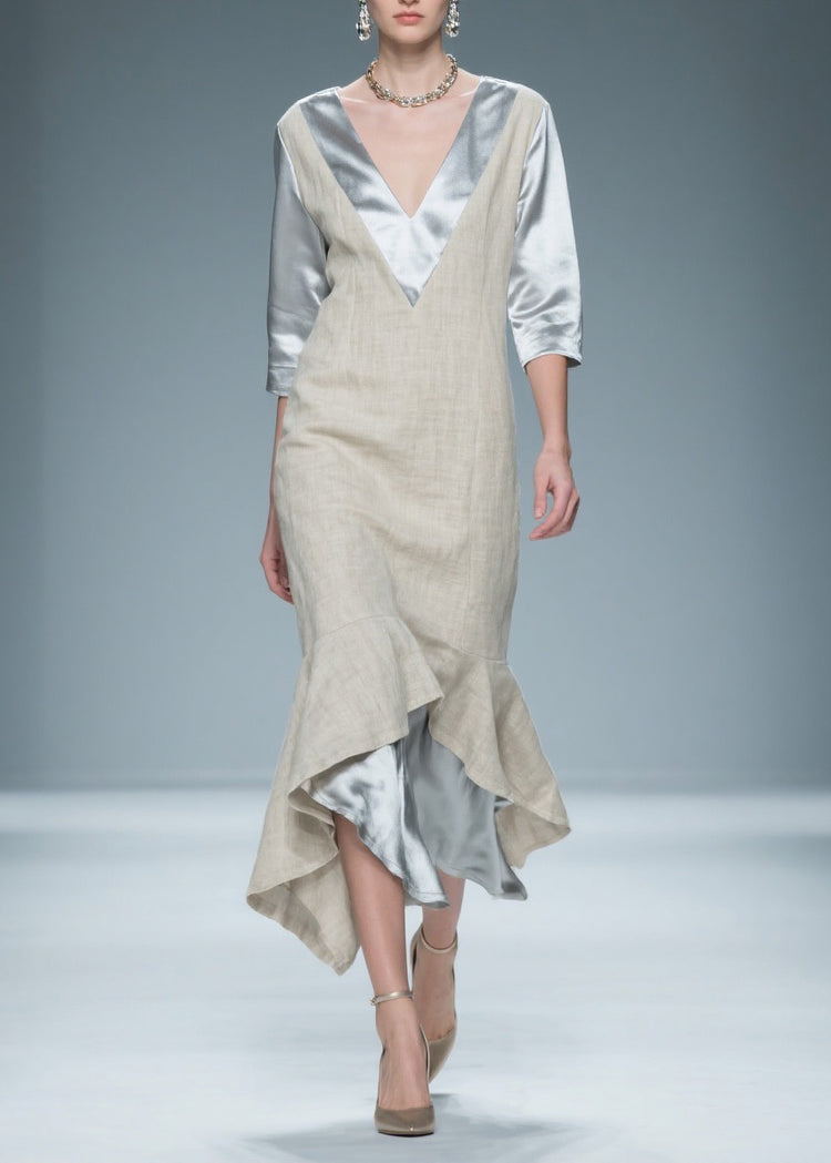 Chic Colorblock V Neck Patchwork Linen Silk Long Dresses Summer