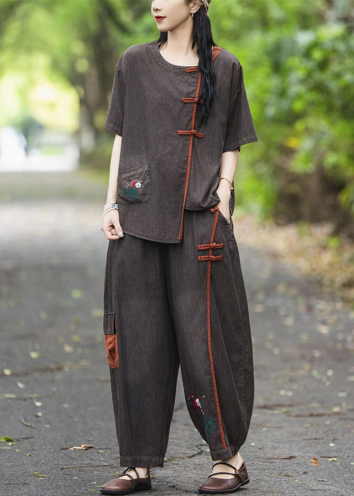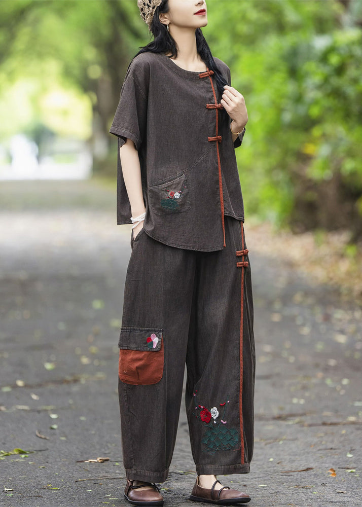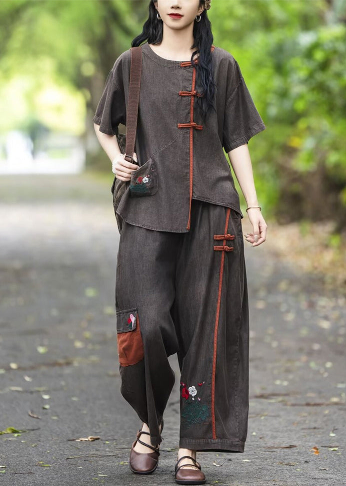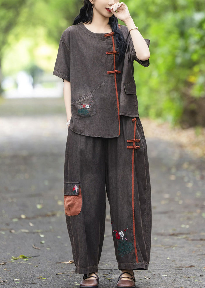 Black Embroidered Pockets Two Piece Set O Neck Short Sleeve