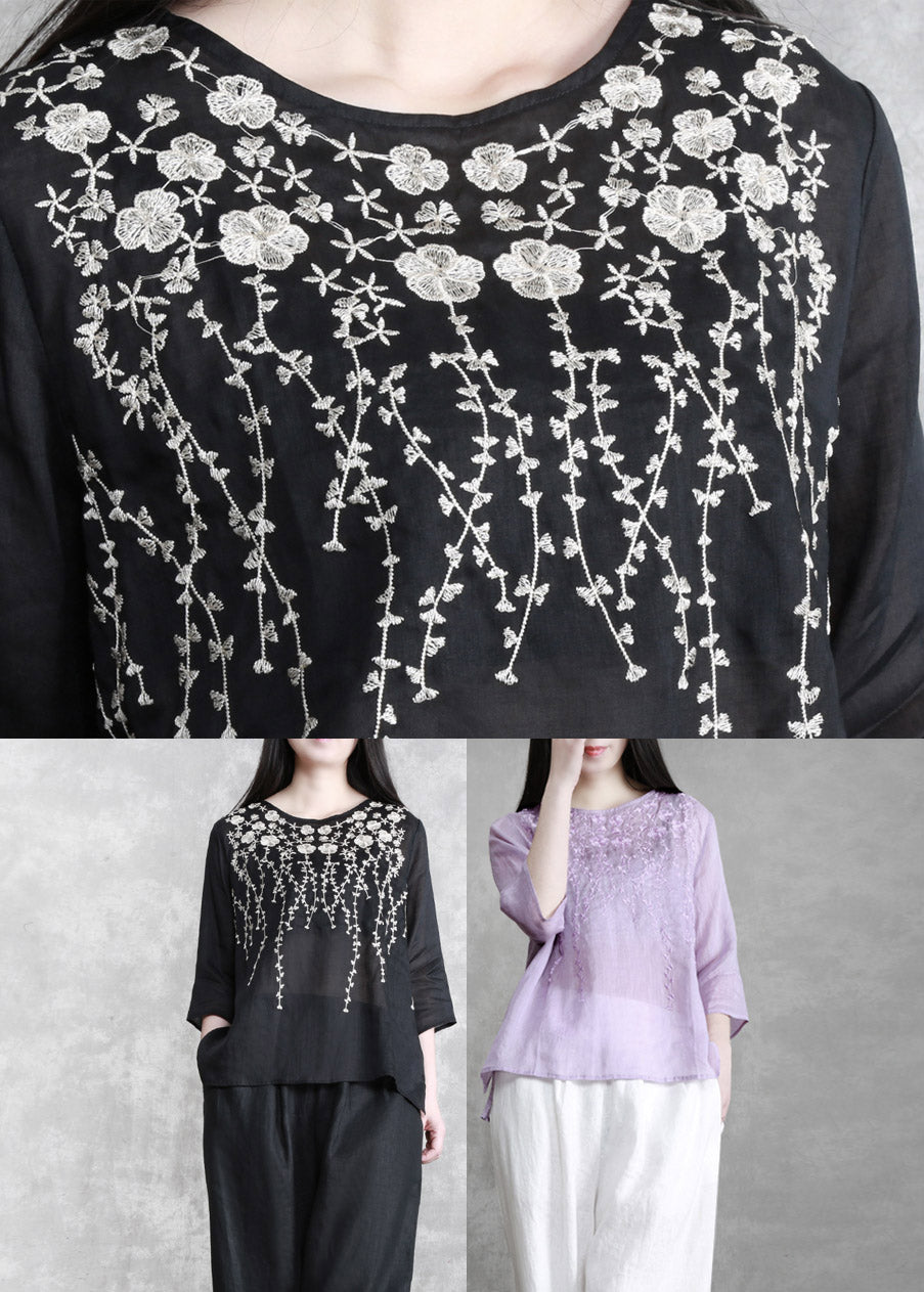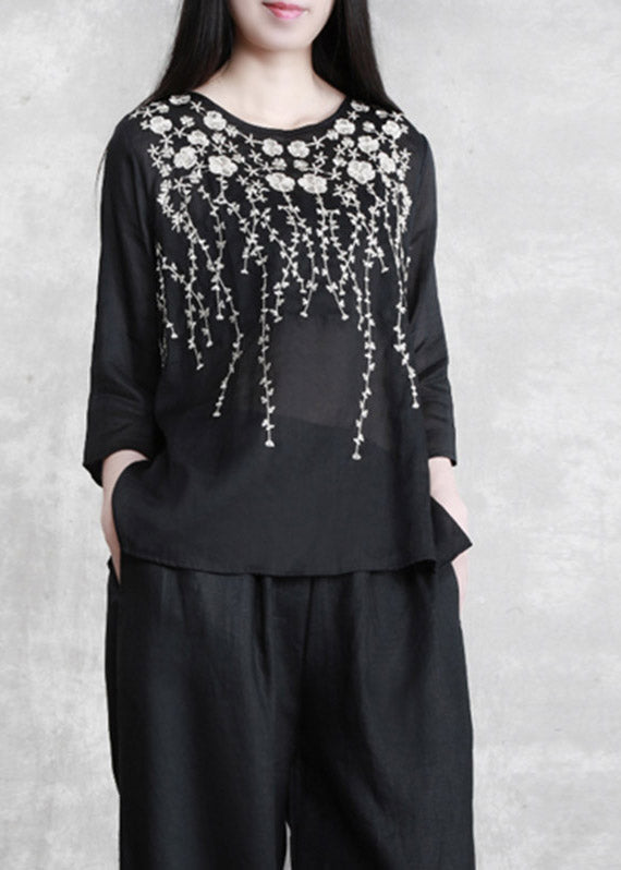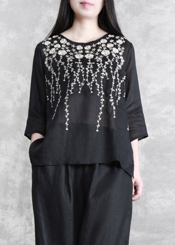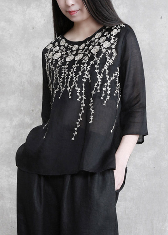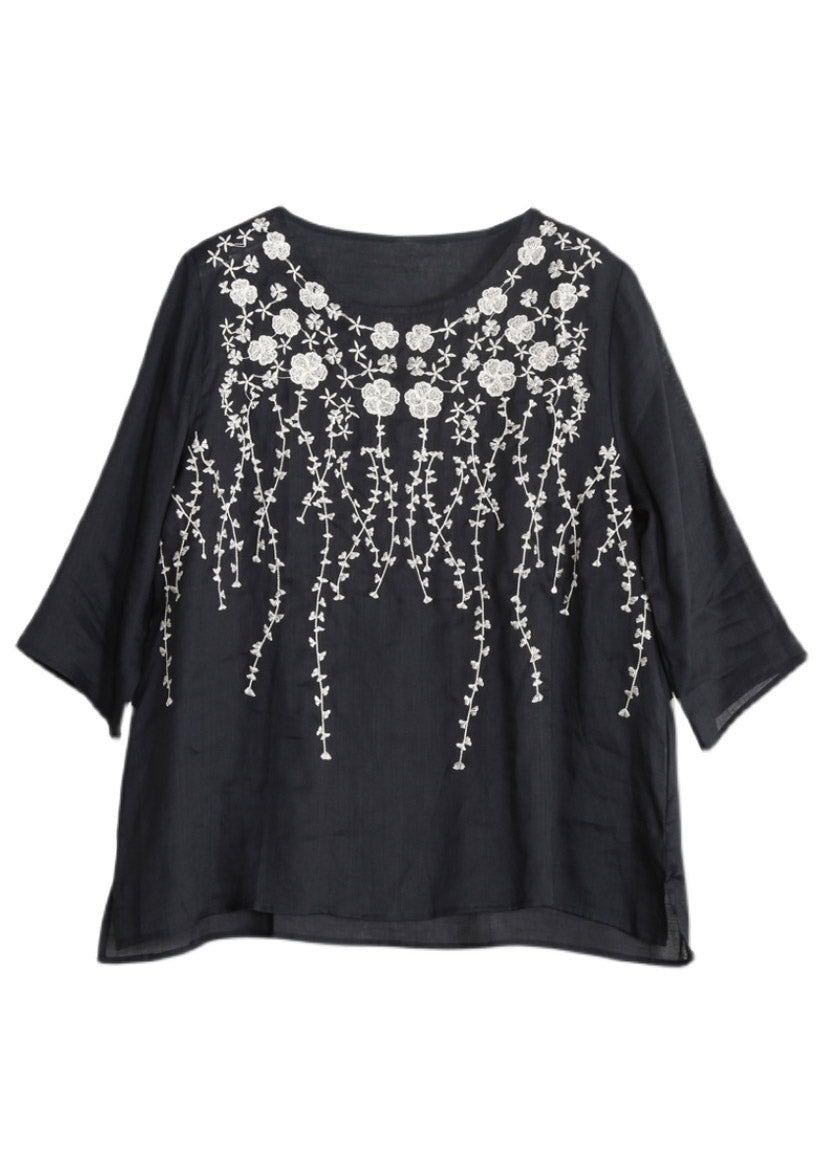 Black Embroideried Floral Linen Top Three Quarter Sleeve
