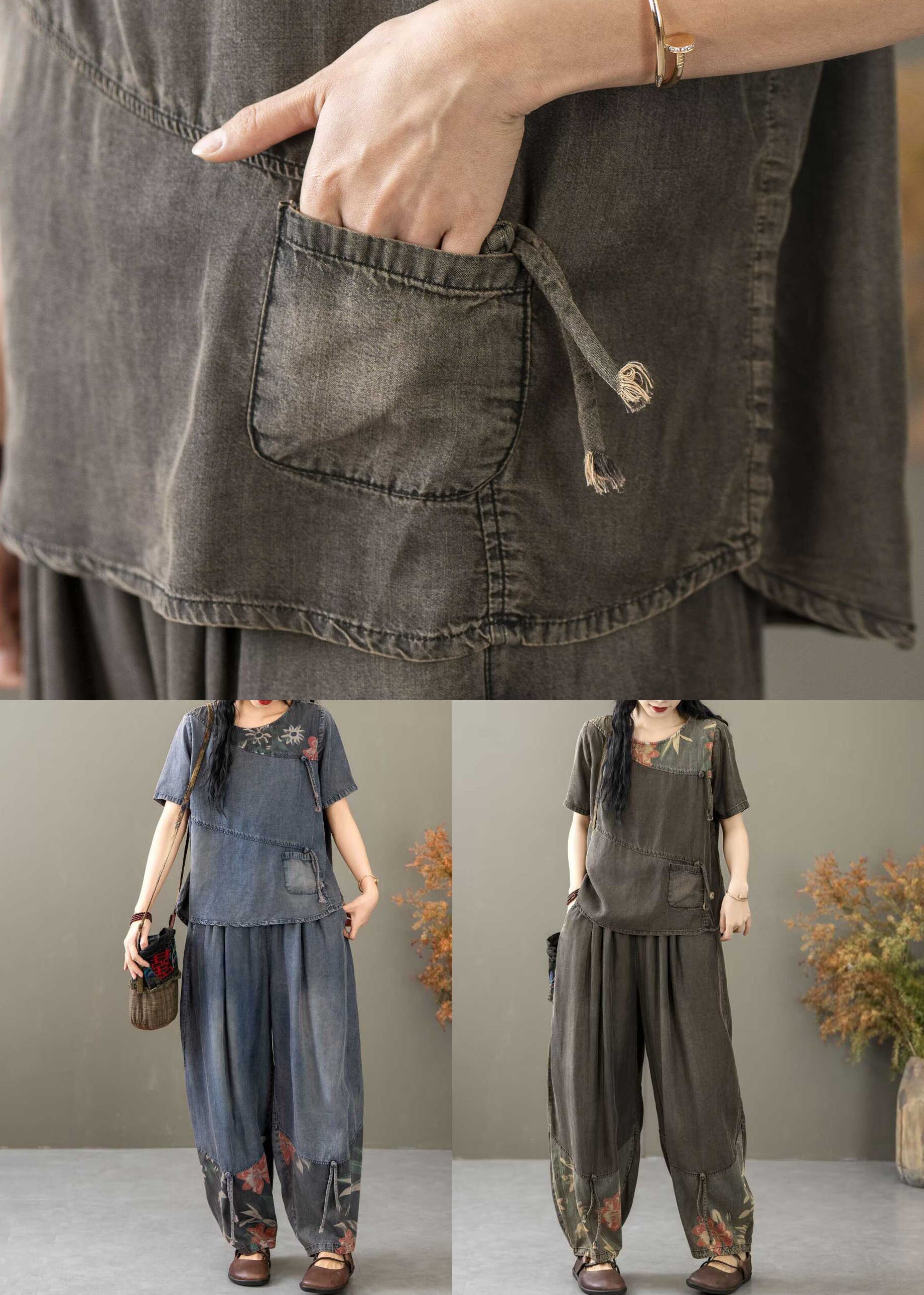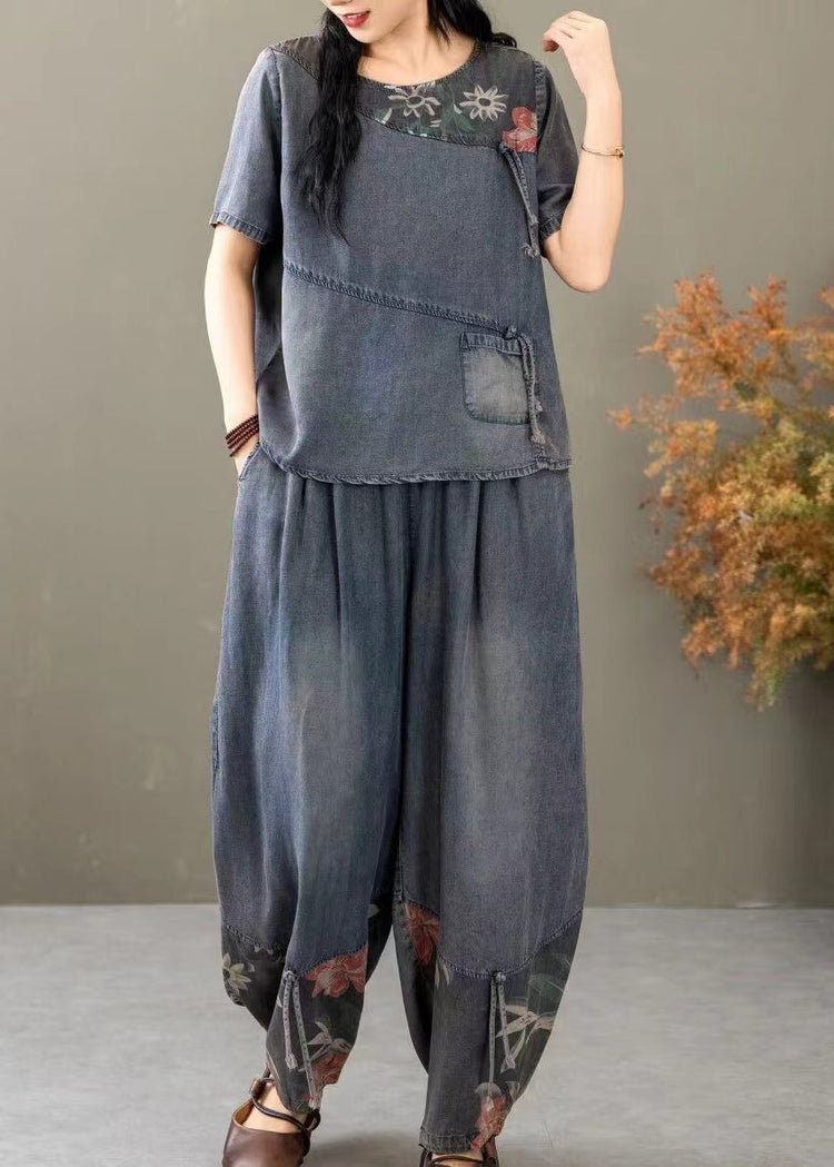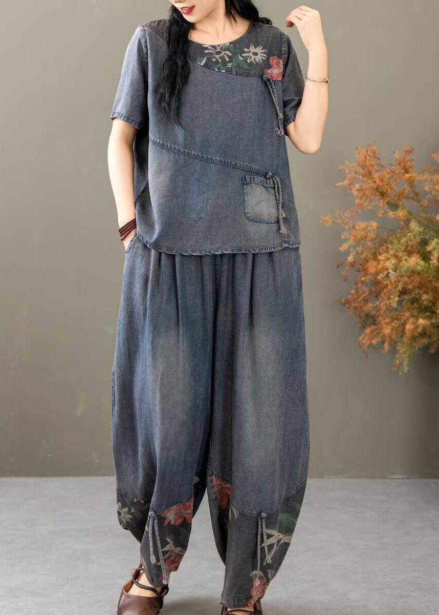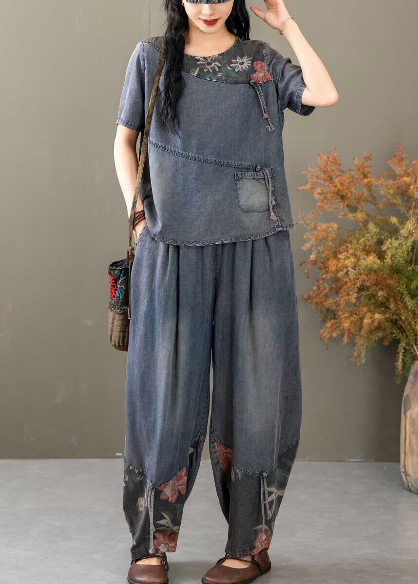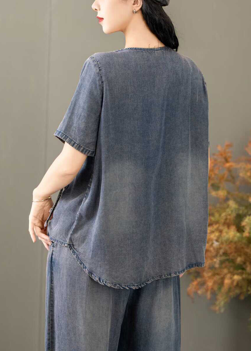 Blue Pockets Patchwork Denim Two Pieces Set O Neck Short Sleeve