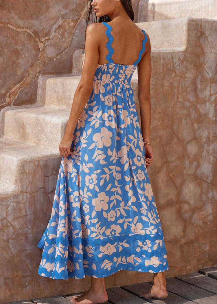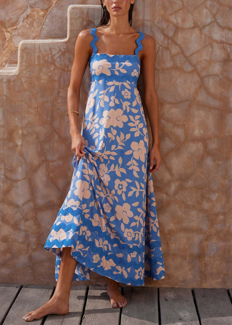 Blue Print Cotton Spaghetti Strap Dress Slash Neck Sleeveless