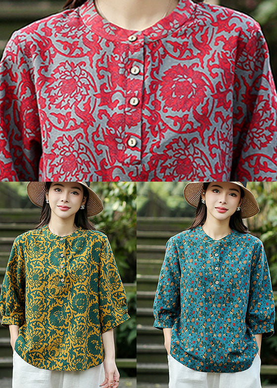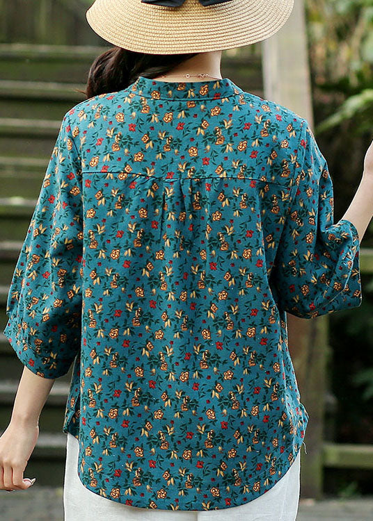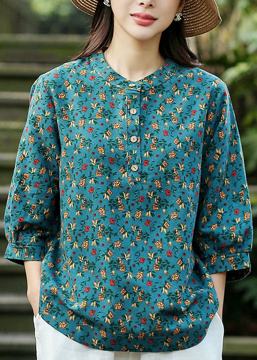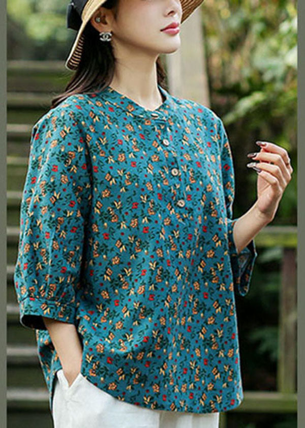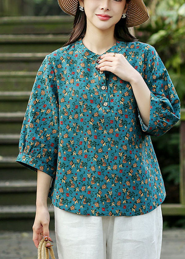 Blue Print Linen Loose Shirts For Women O-Neck Button Bracelet Sleeve
