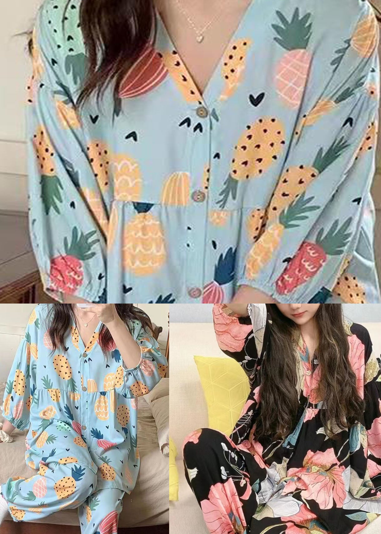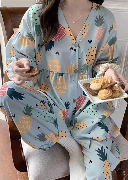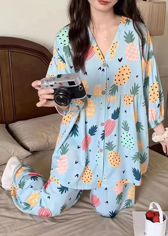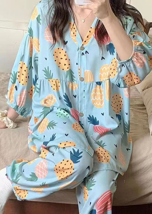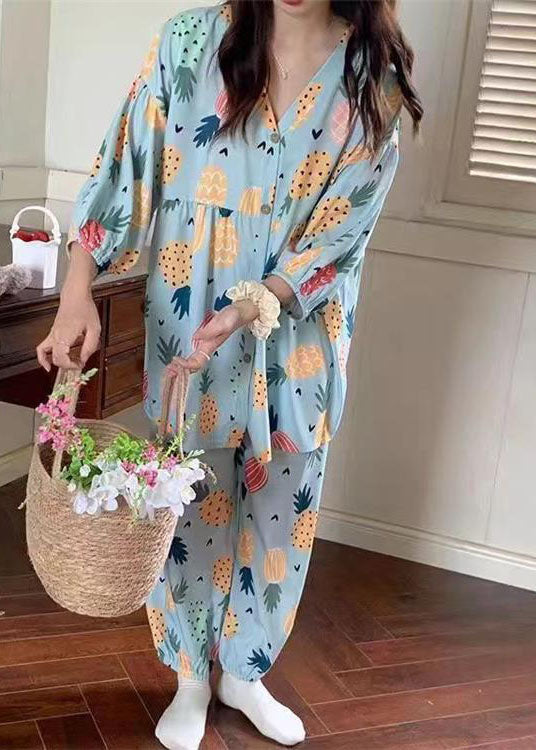 Blue Print Patchwork Cotton Two Pieces Set Pajamas V Neck Summer