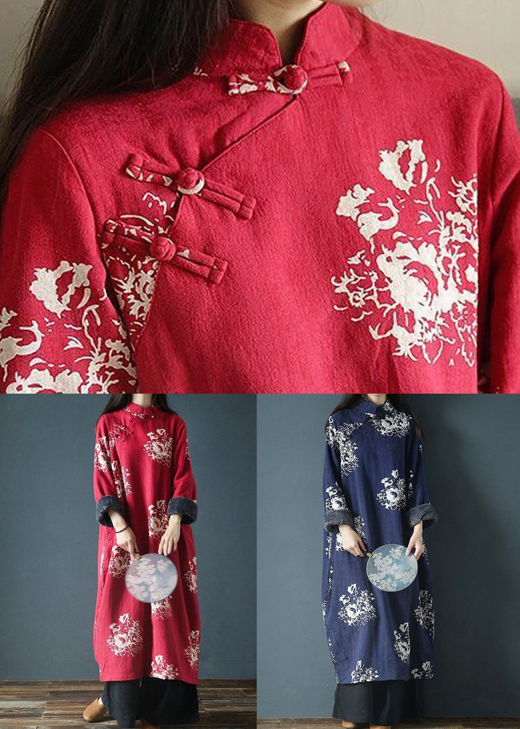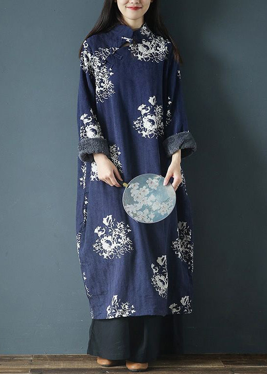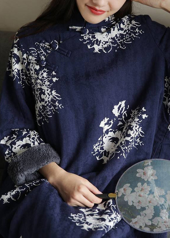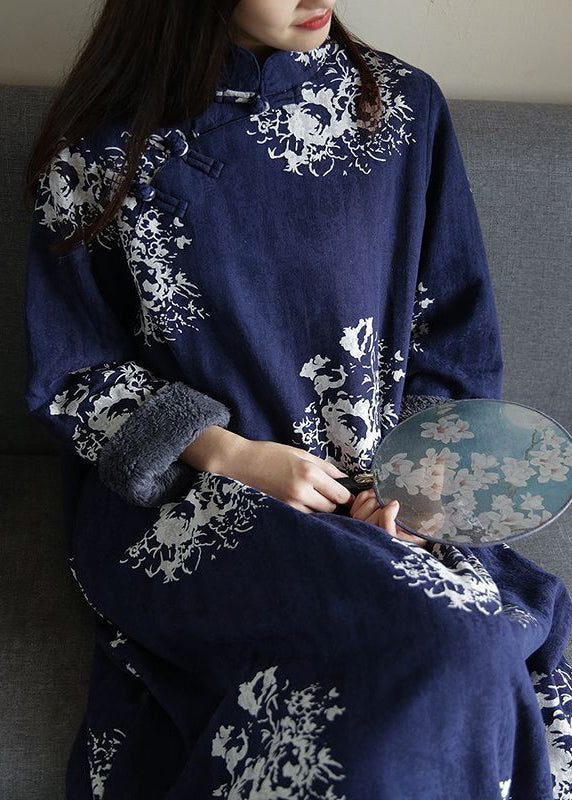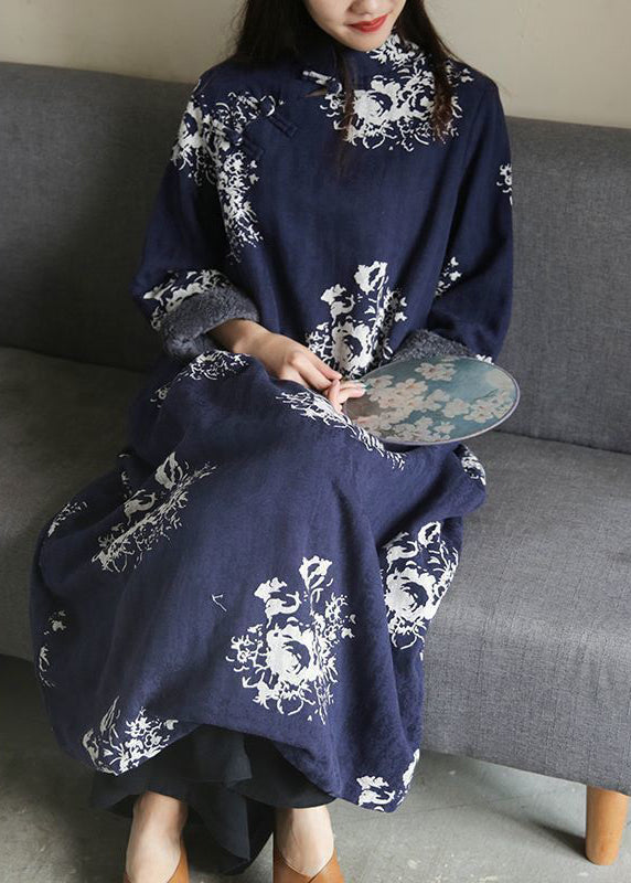 Blue Print Patchwork Fleece Dress Stand Collar Long Sleeve