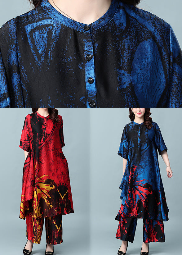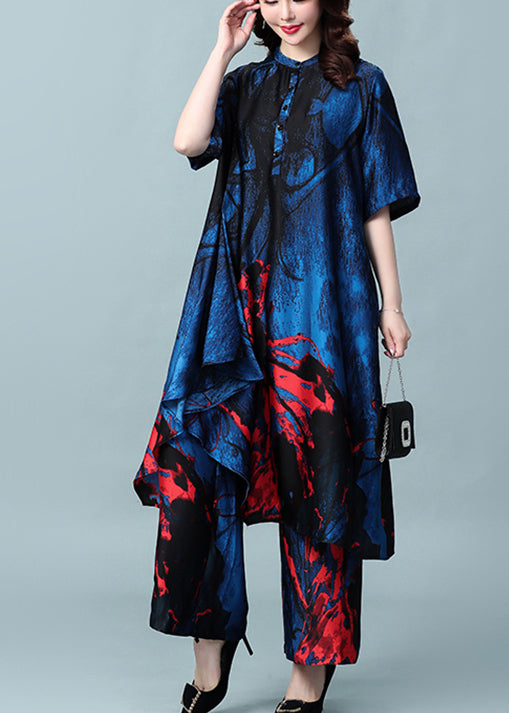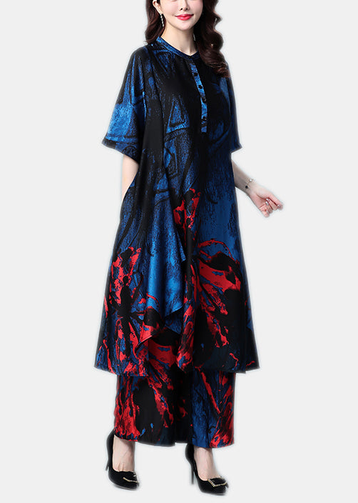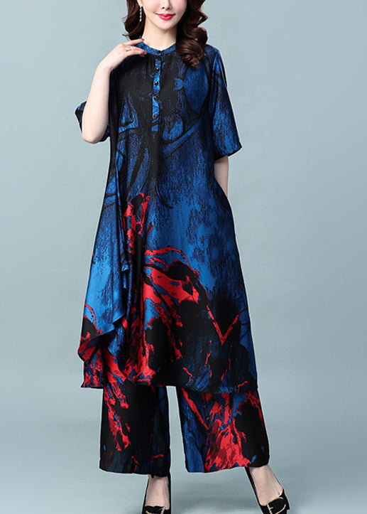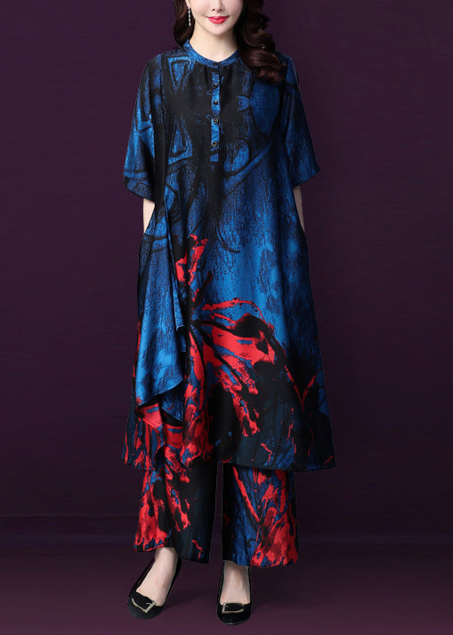Blue Print Silk Dress And Wide Leg Pants Two Piece Set Outfits Stand Collar Button Summer
