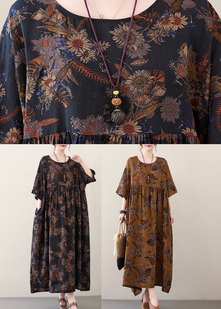 Blue Print Wrinkled Vacation Long Dresses Half Sleeve