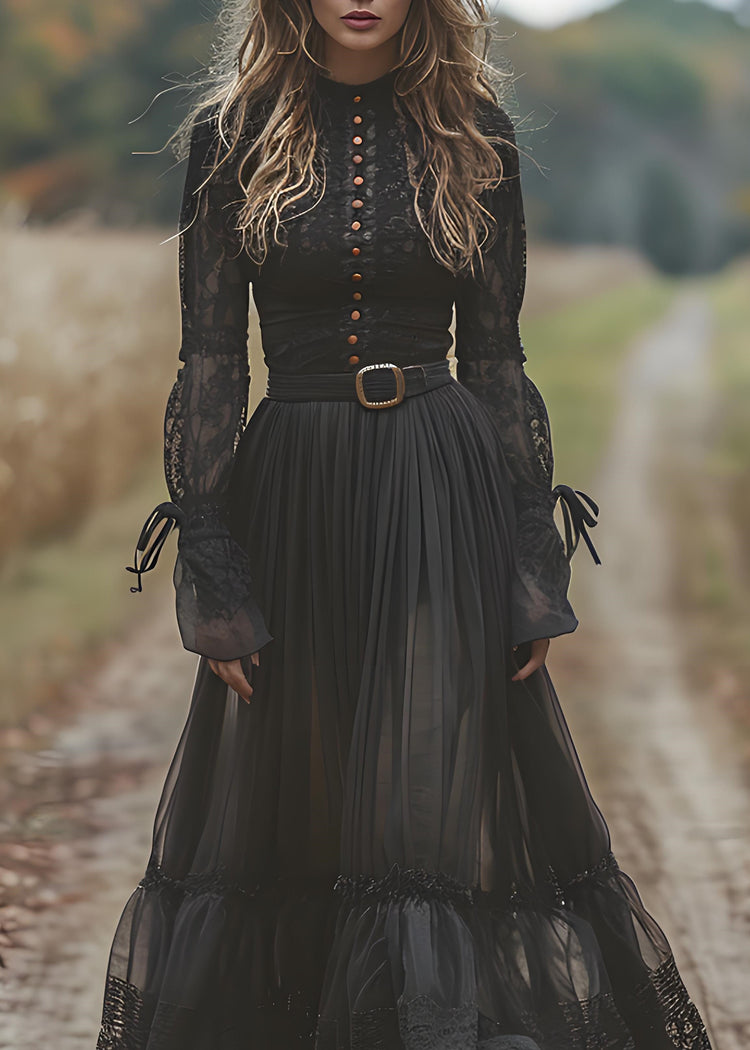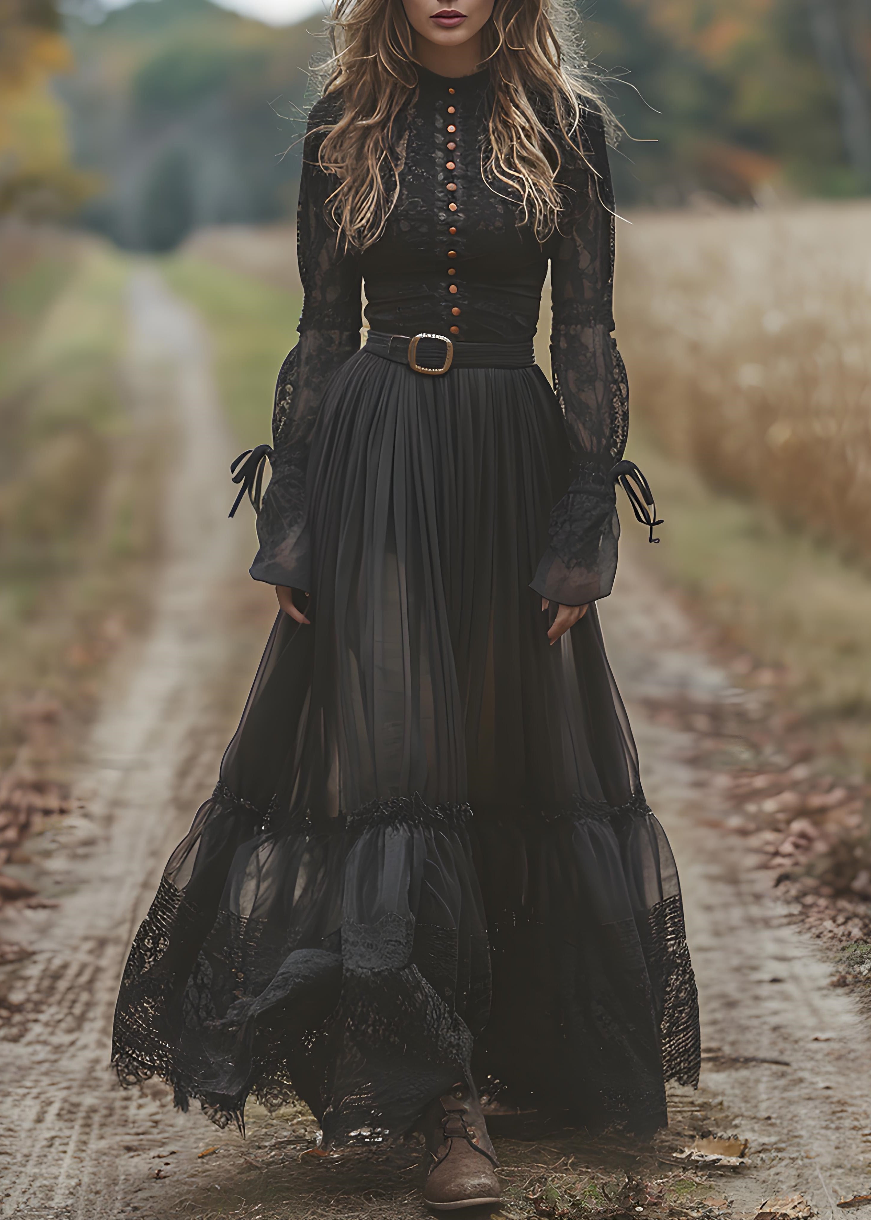 Bohemian Black Lace Patchwork Wrinkled Cotton Maxi Dresses Spring