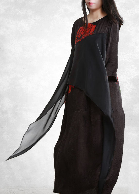 Bohemian Black O-Neck Asymmetrical Floral Print Long Dresses Three Quarter sleeve