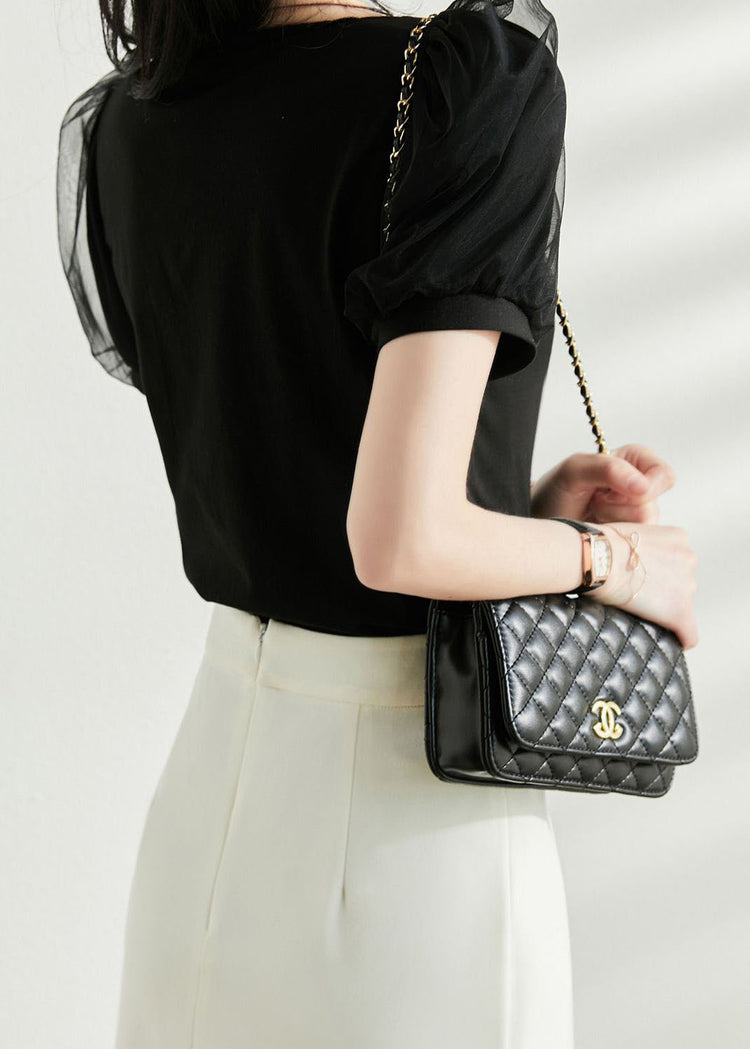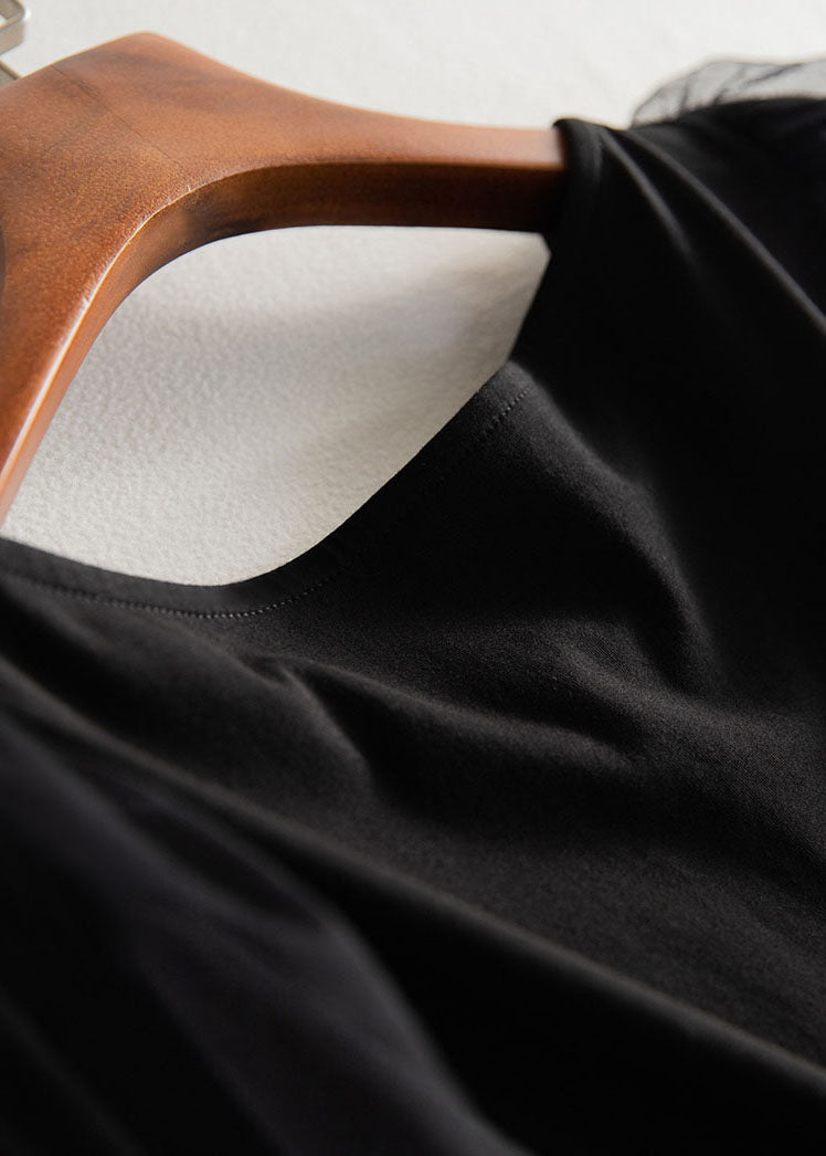 French Black Puff Sleeve Tulle Patchwork Knit T Shirt Top