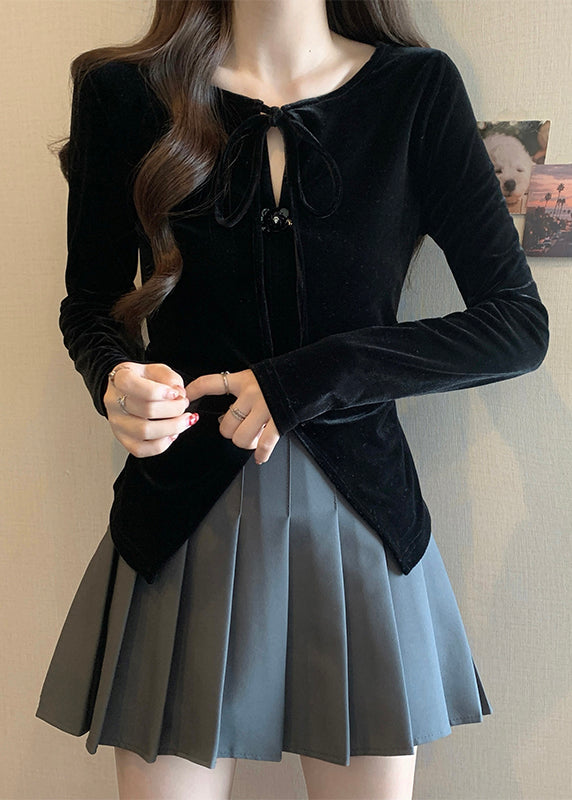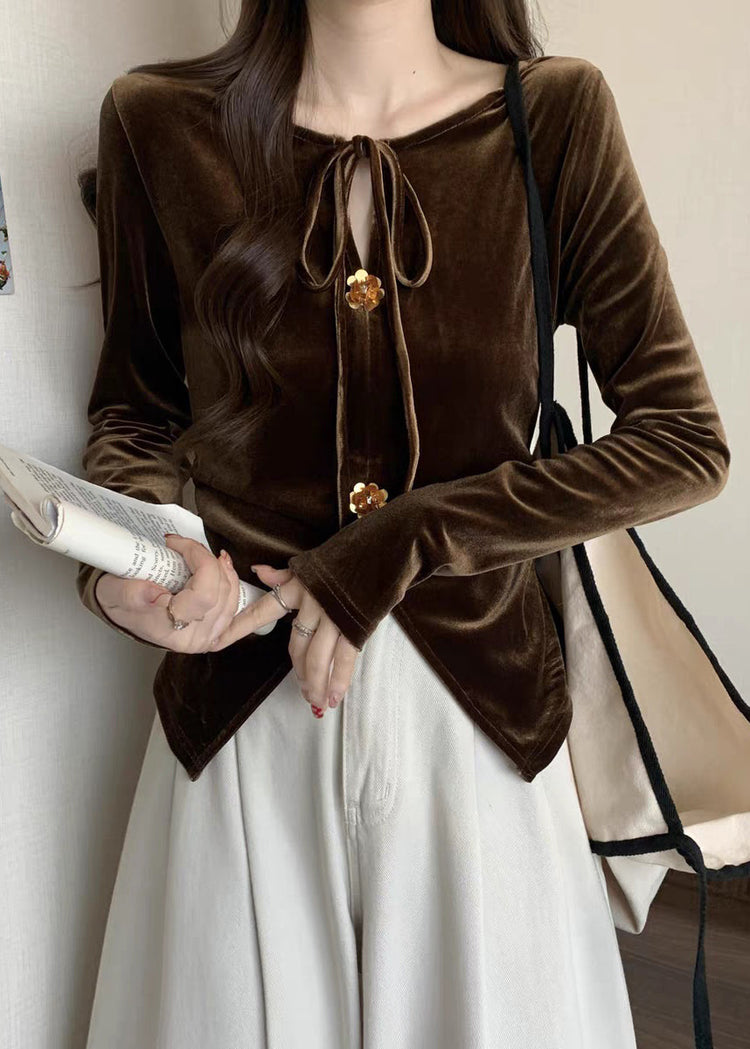 French Brown Lace Up Front Open Silk Velour Shirts Winter