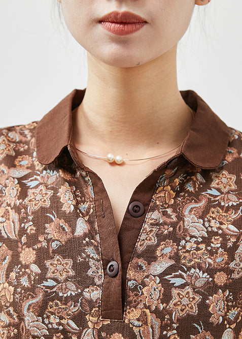 French Brown Peter Pan Collar Print Linen Mini Dress Sleeveless