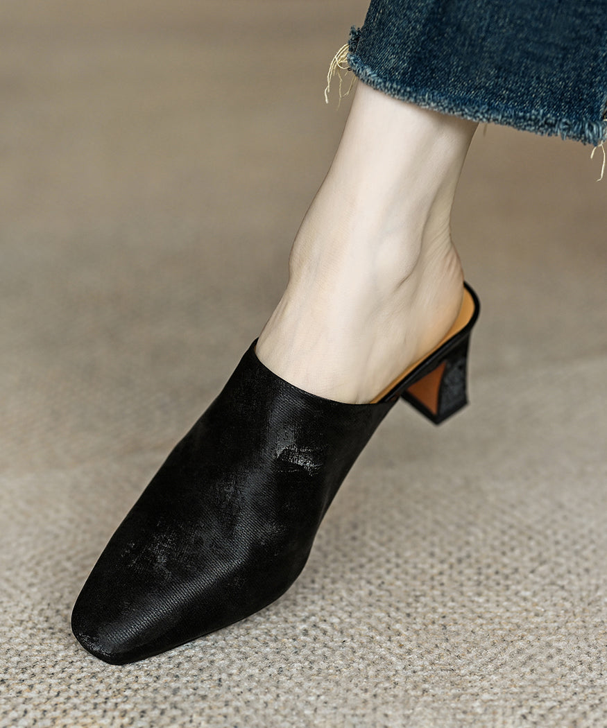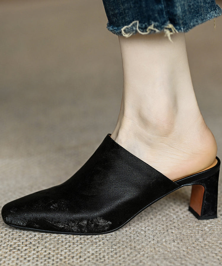 French Brown Satin Cowhide Leather Chunky Heel Slide Sandals