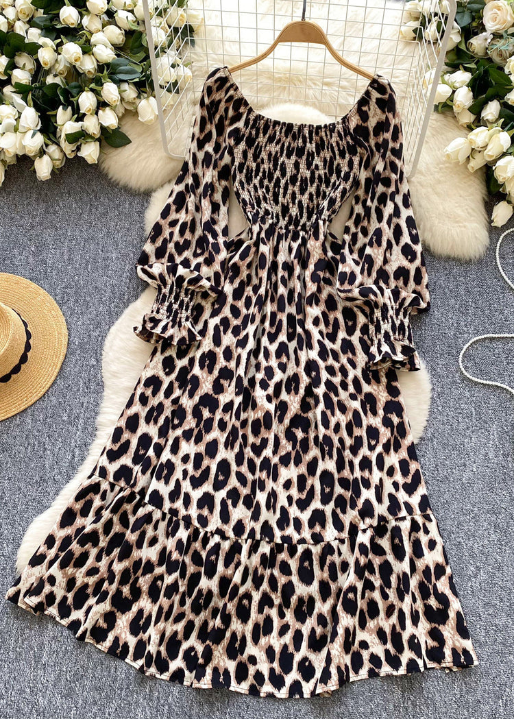 French Brown Square Collar Leopard Print Chiffon Robe Dresses Spring