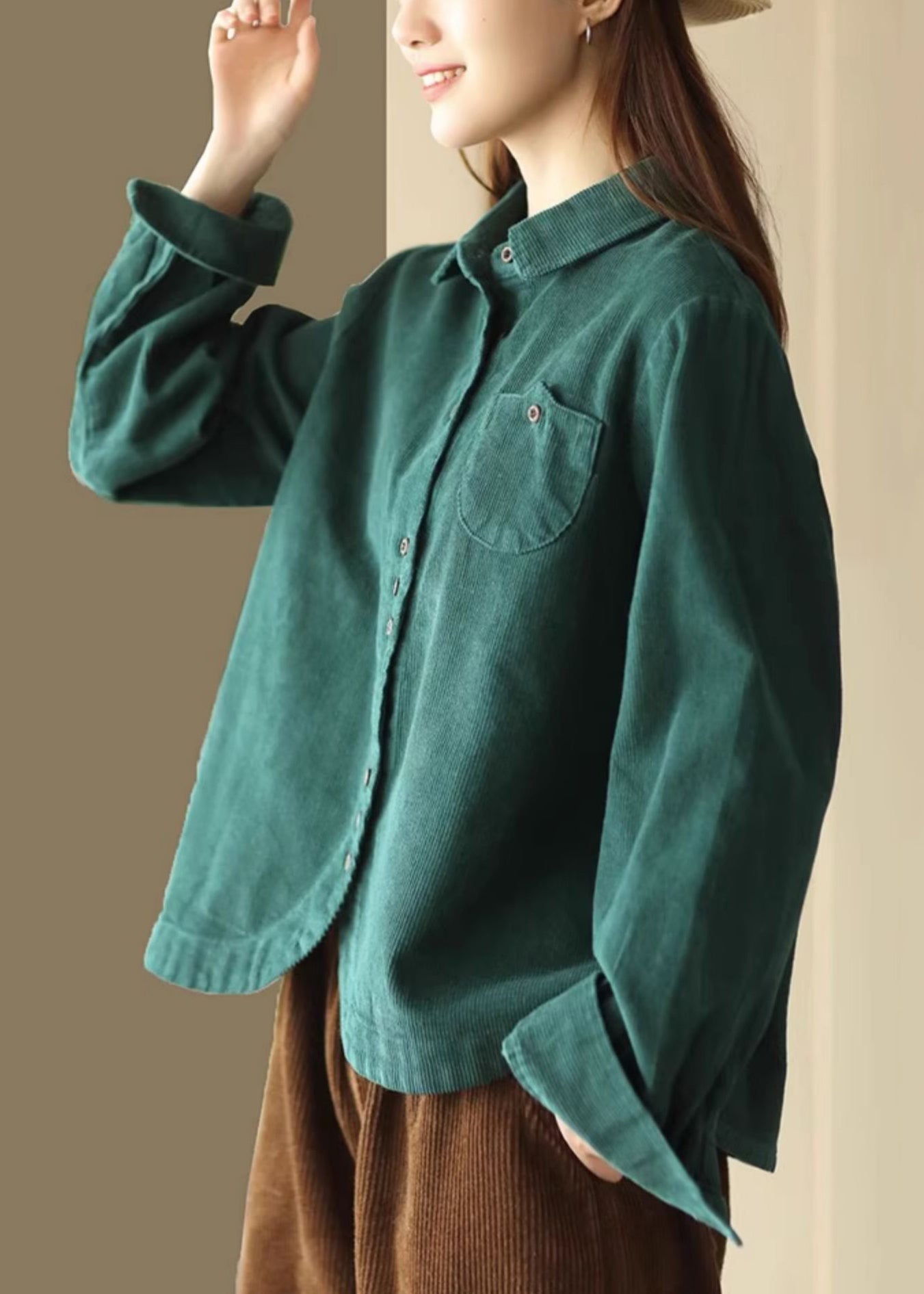 French Green Button Pockets Corduroy Blouses Long Sleeve