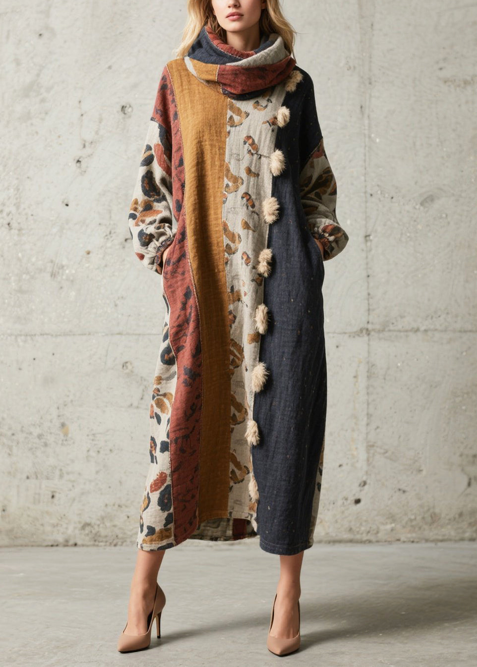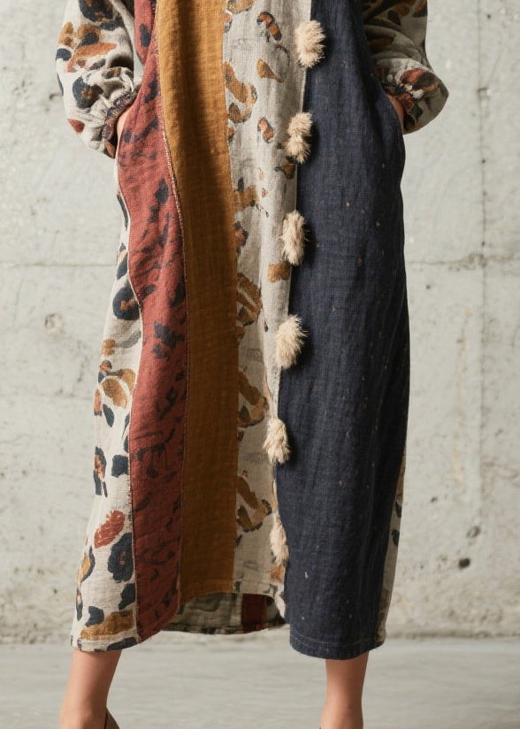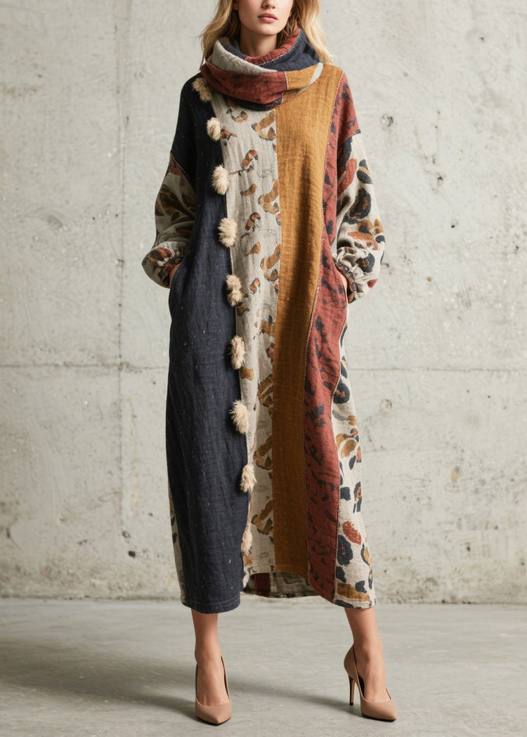 French Oversized Patchwork Fuzzy Ball Decorated Long Dresses Fall