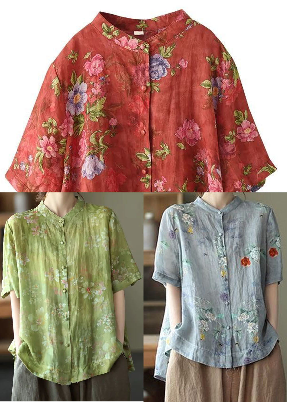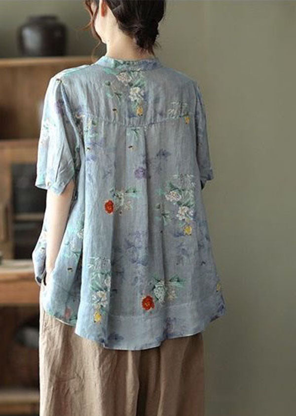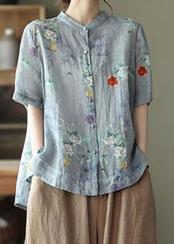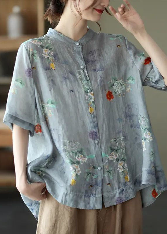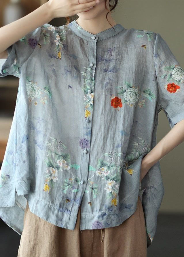 Grey Purple Print Cotton Shirts Low High Design Short Sleeve