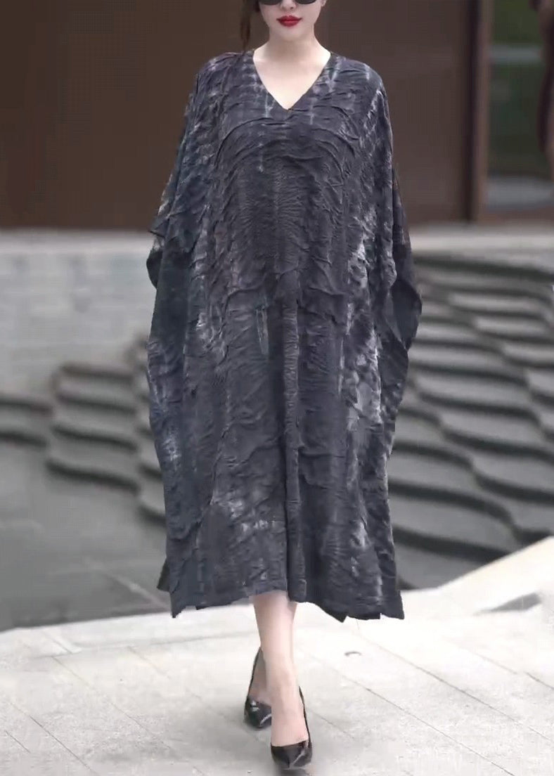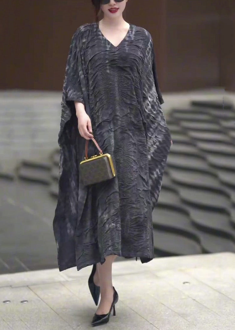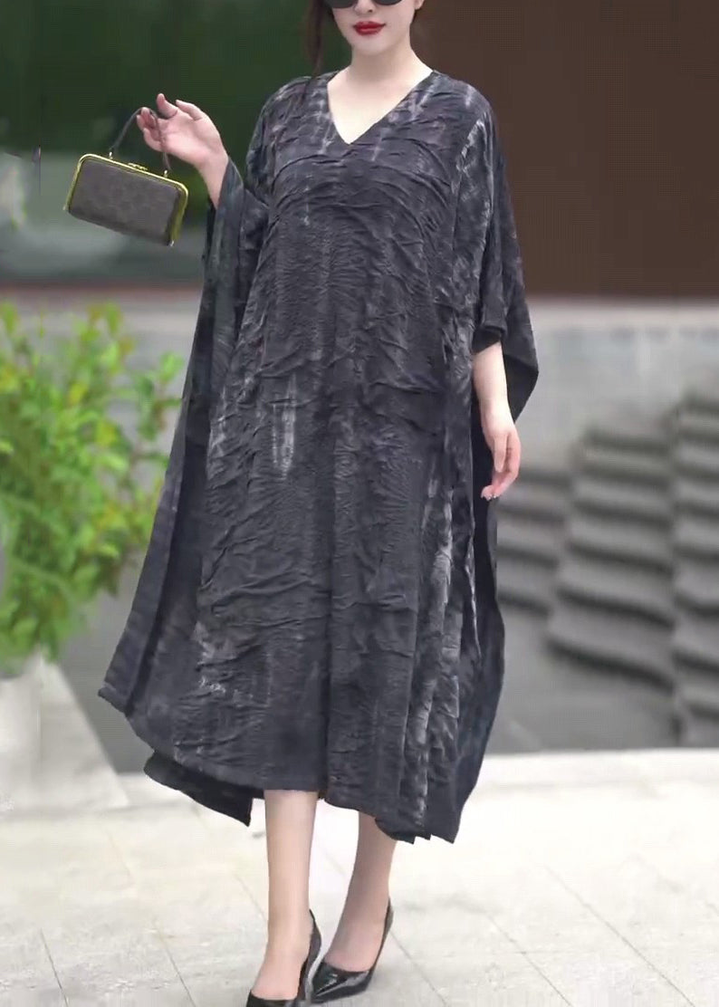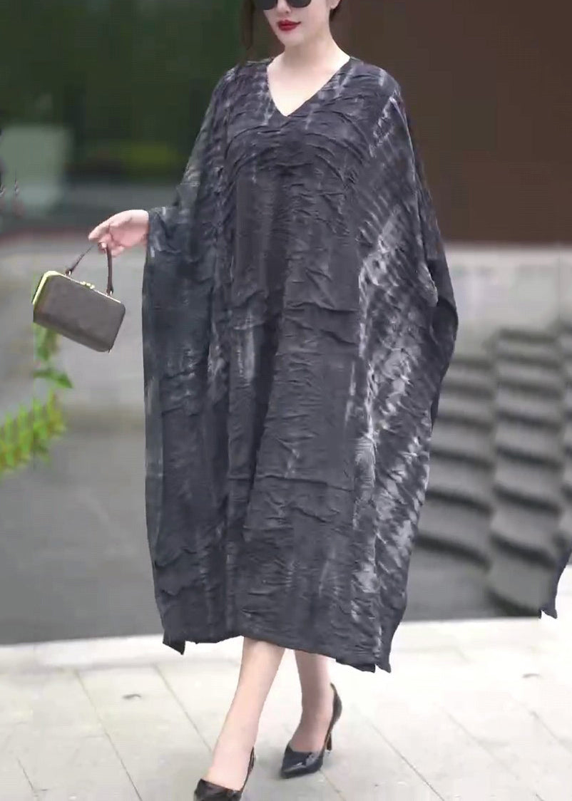 Handmade Black V Neck Wrinkled Long Dresses Batwing Sleeve