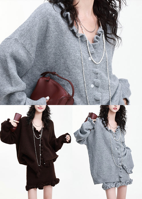 Chic Grey Ruffled Flower Decorated Knit Cardigan And Skirt 2 Piece Outfit Winter