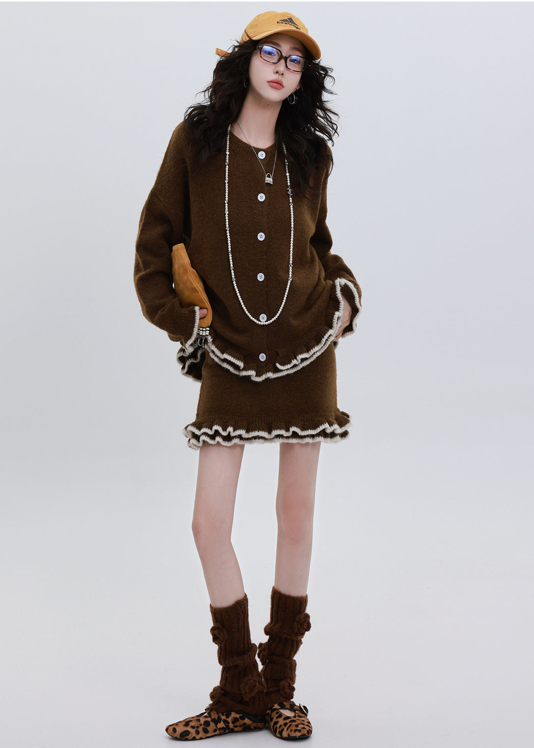 Chocolate Cozy Knit Cardigan And Skirt Two Pieces Set Ruffled Winter