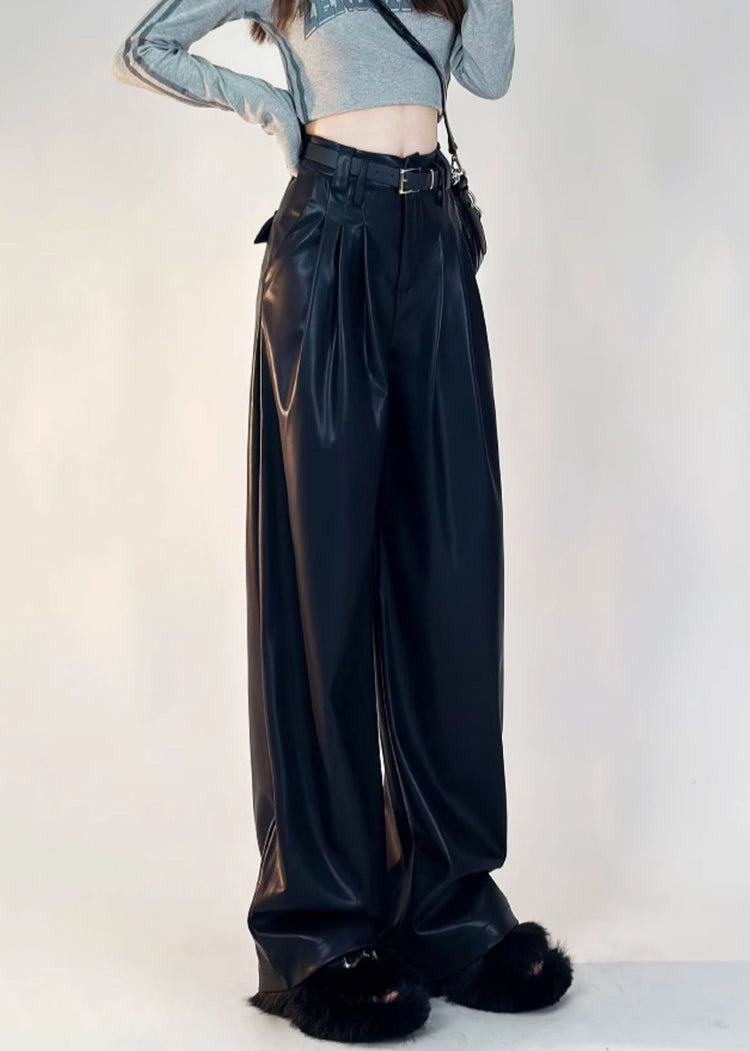 Boutique Black Pockets Solid Warm Fleece Faux Leather Pants