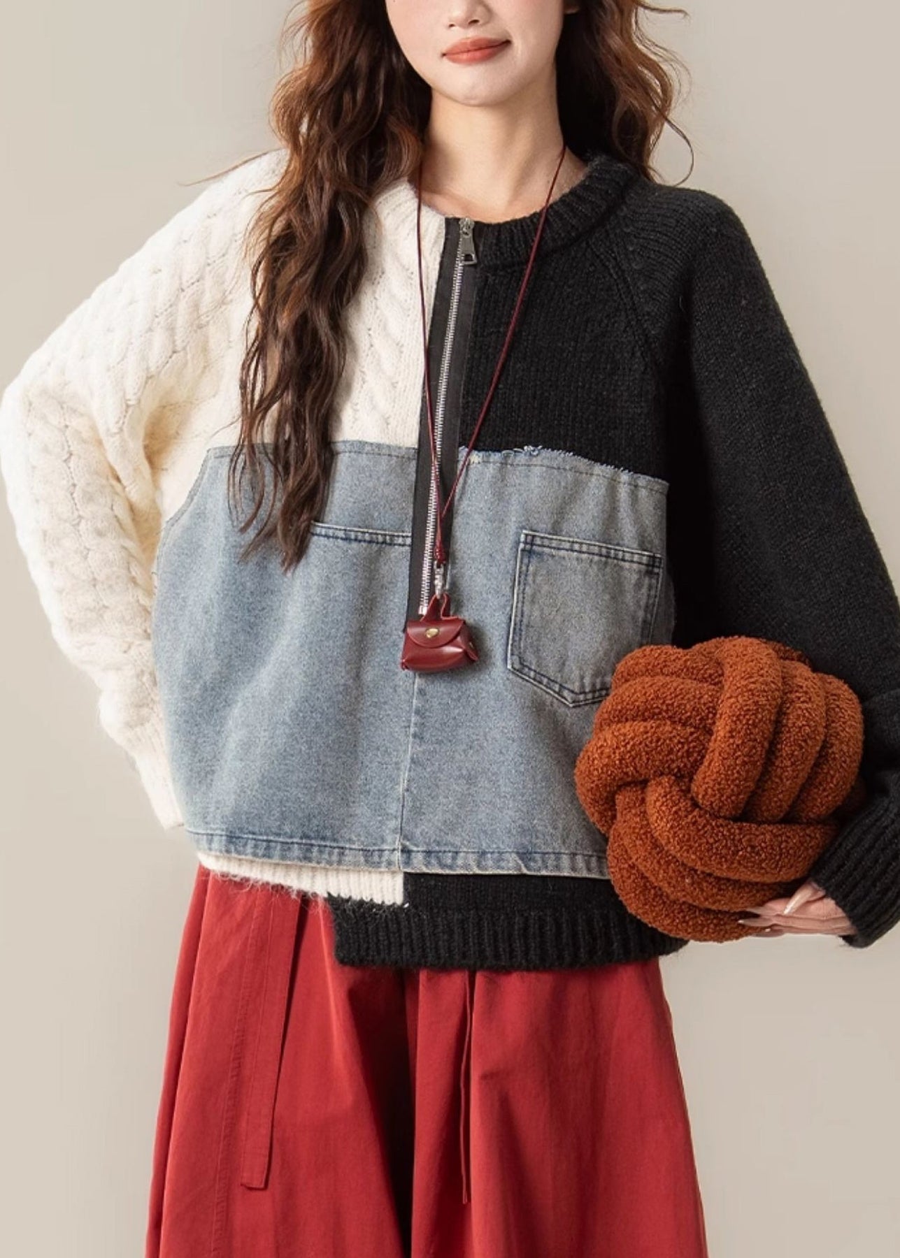 Chic Black Zip Up Denim Patchwork Knit Sweater Spring