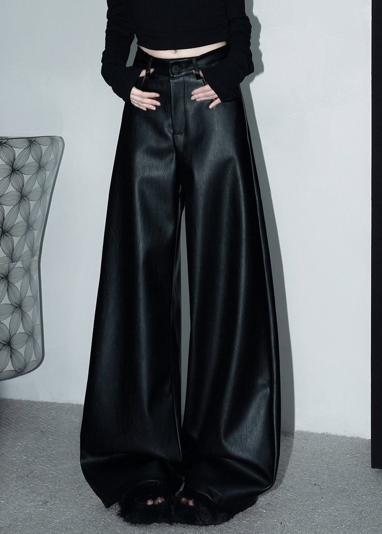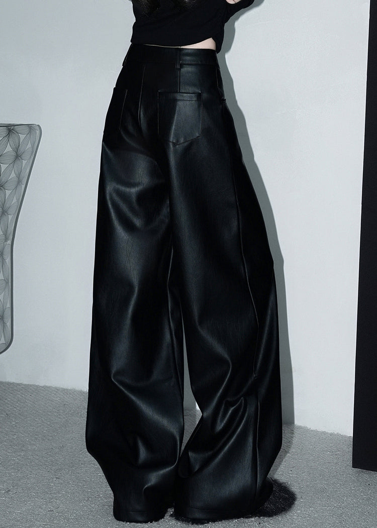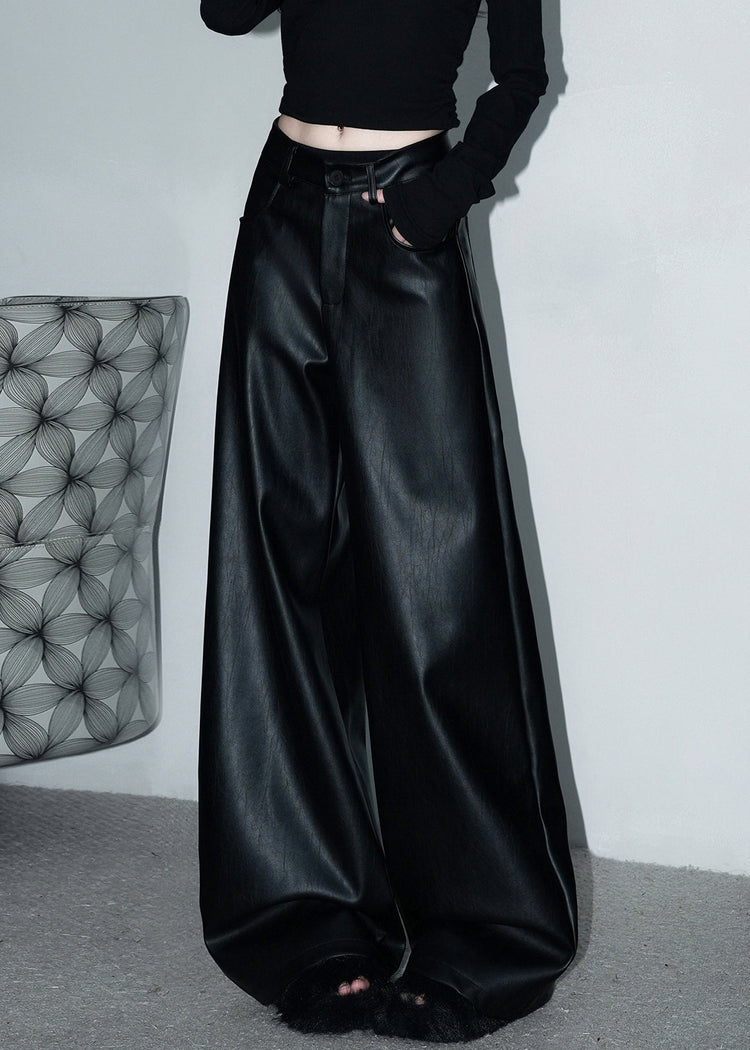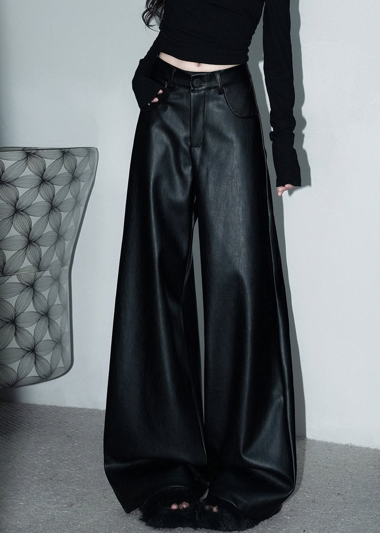 Stylish Black Button Pockets Faux Leather Wide Leg Pants Spring