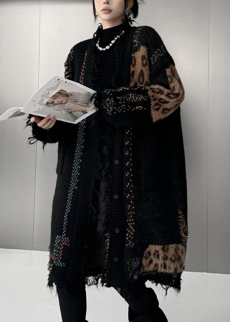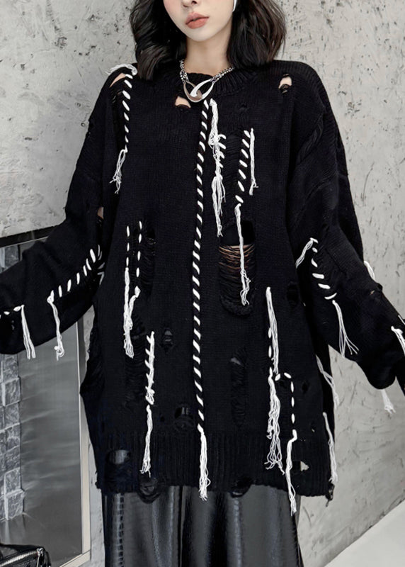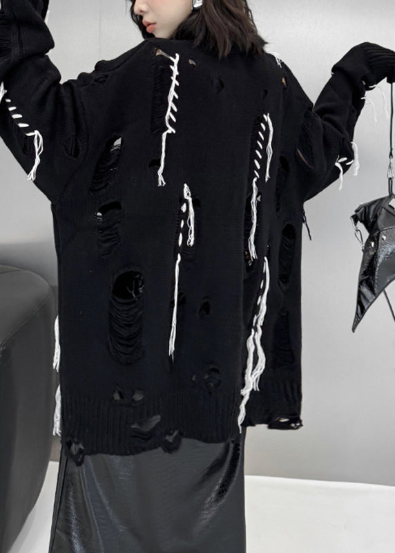 Fashion Black Graphic Hole Thick Cotton Knit Sweater Fall