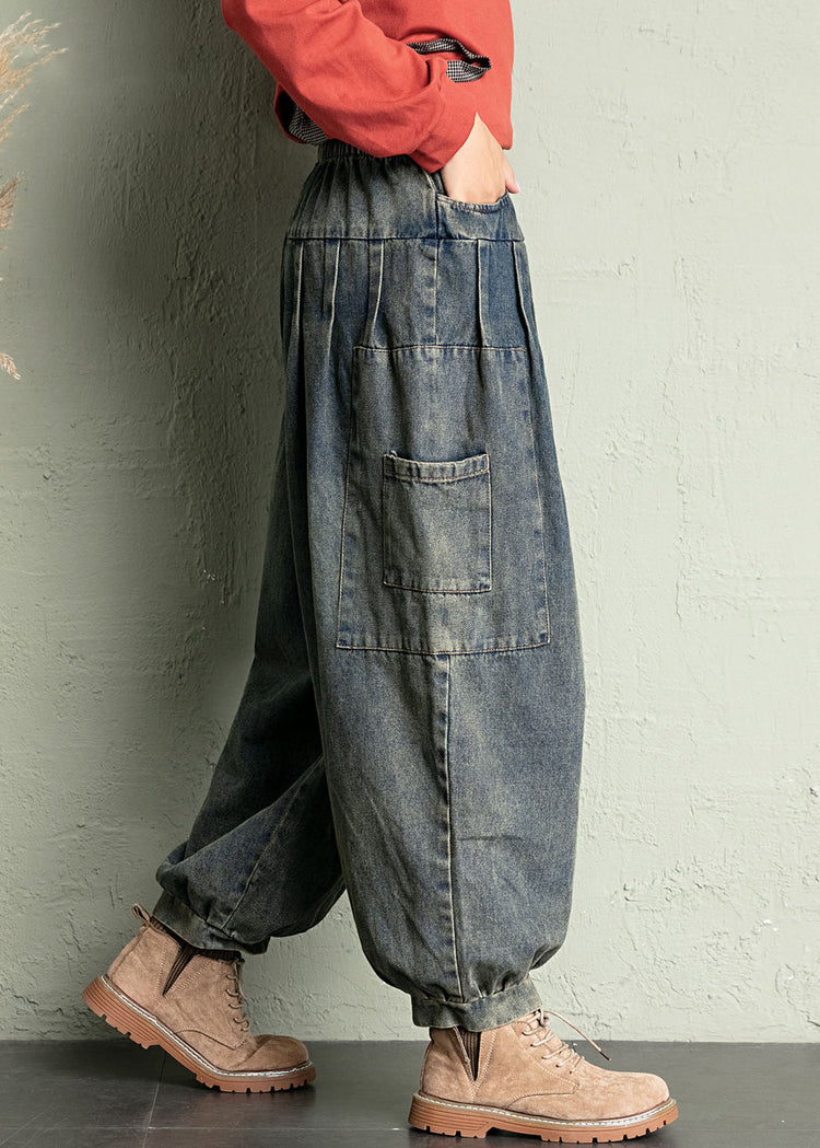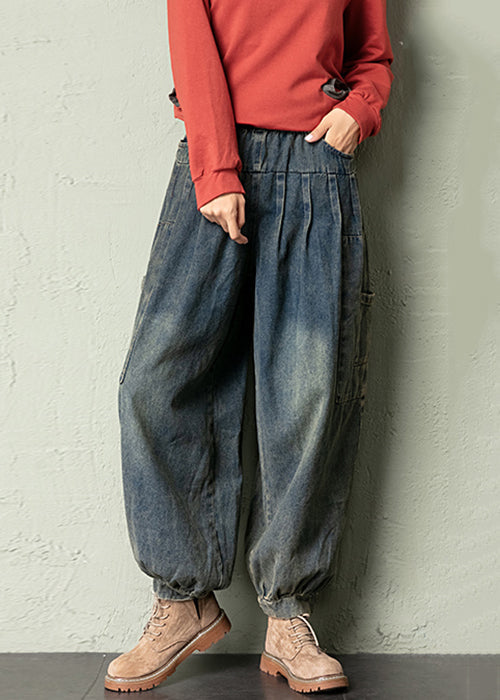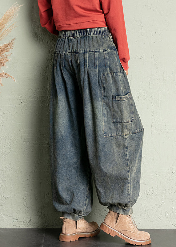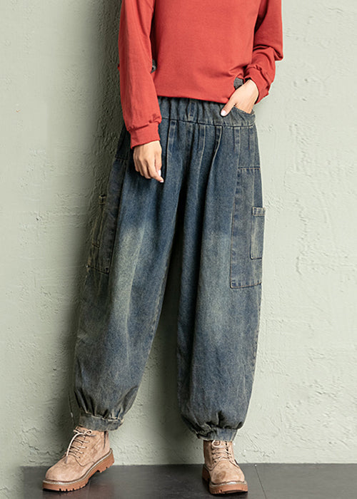 Vintage Blue Pockets Elastic Waist Denim Crop Pants Spring