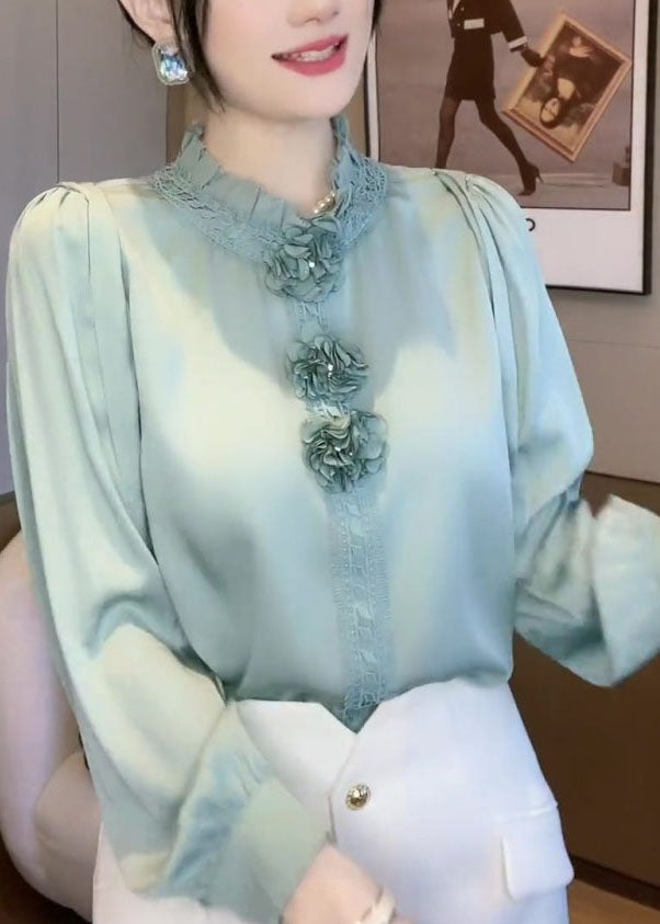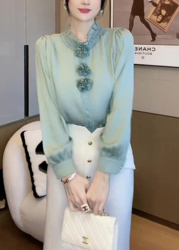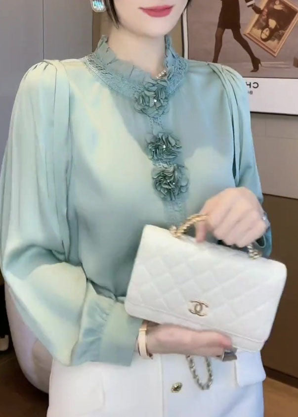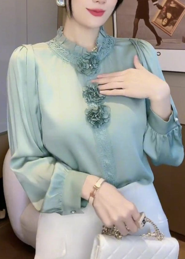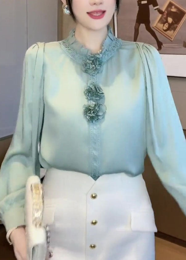 Women Blue Ruffled Patchwork Floral Chiffon Blouses Spring
