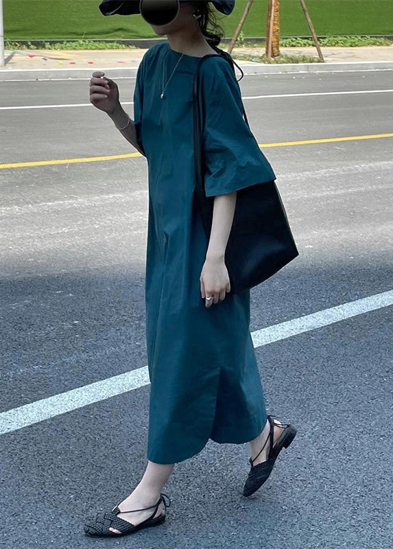 Vintage Blue O Neck High Waist Cotton Long Dress Half Sleeve