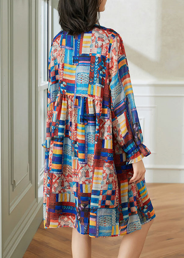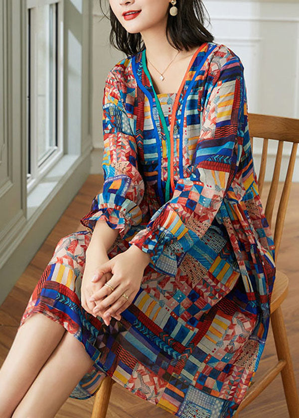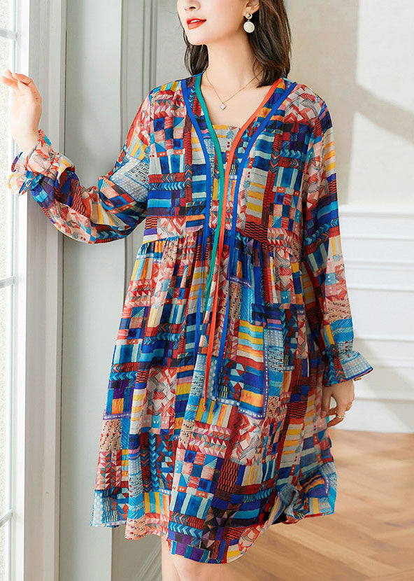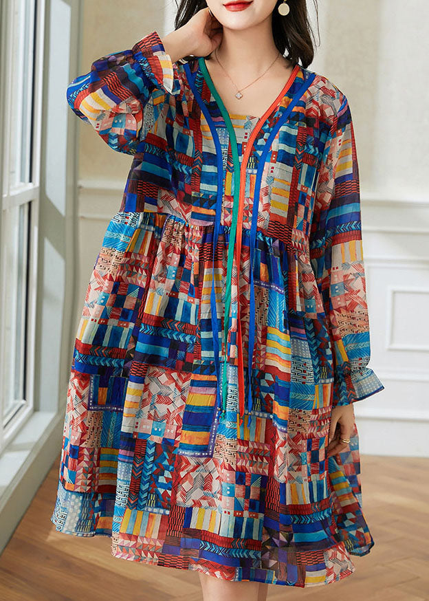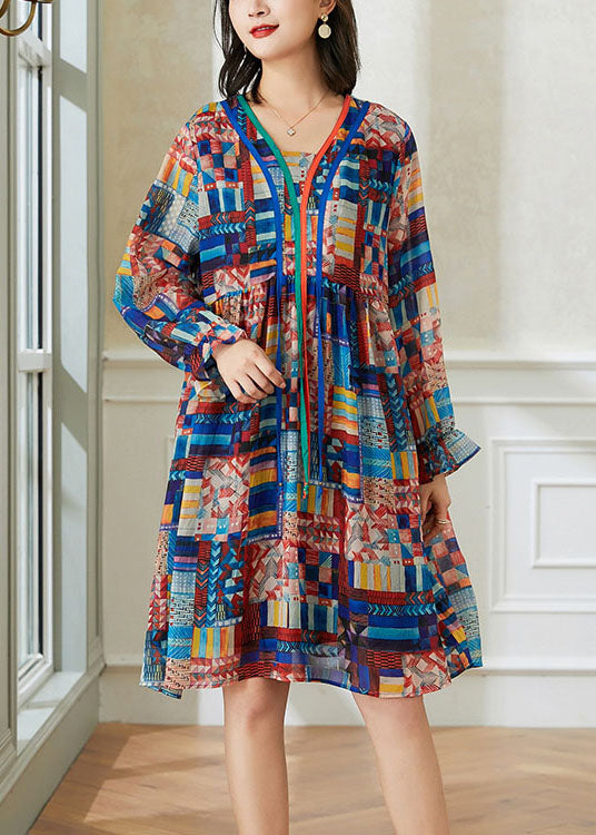 Stylish Blue V Neck Wrinkled Print Patchwork Chiffon Mid Dress Spring