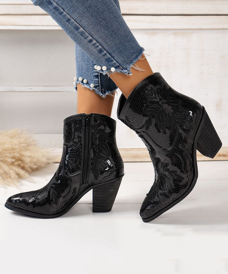 Chic Black Embossed Sequins Cotton Fabric Chunky Ankle Boots