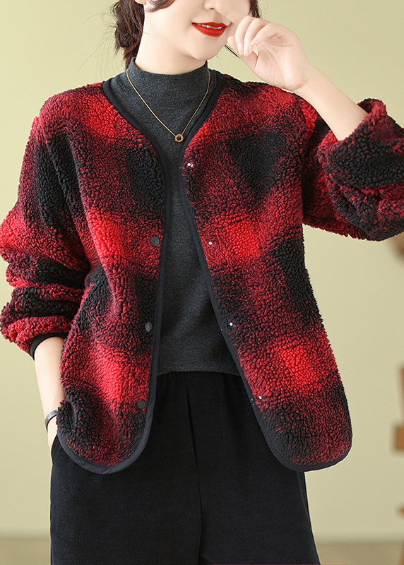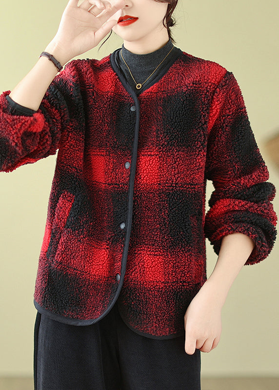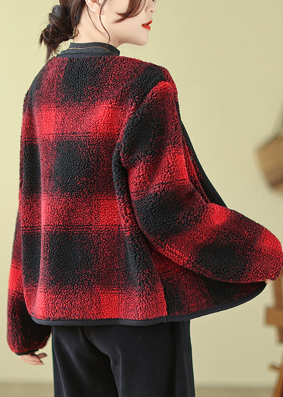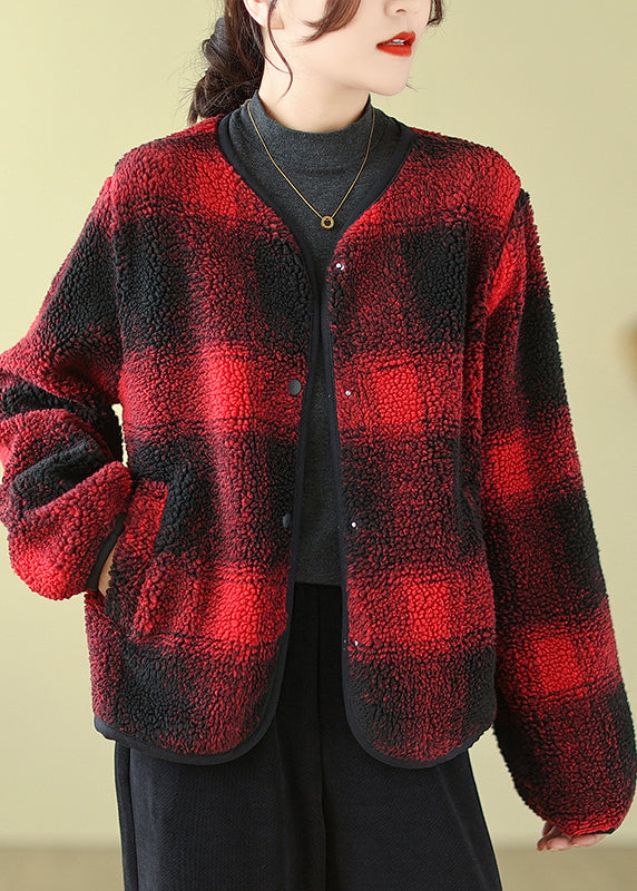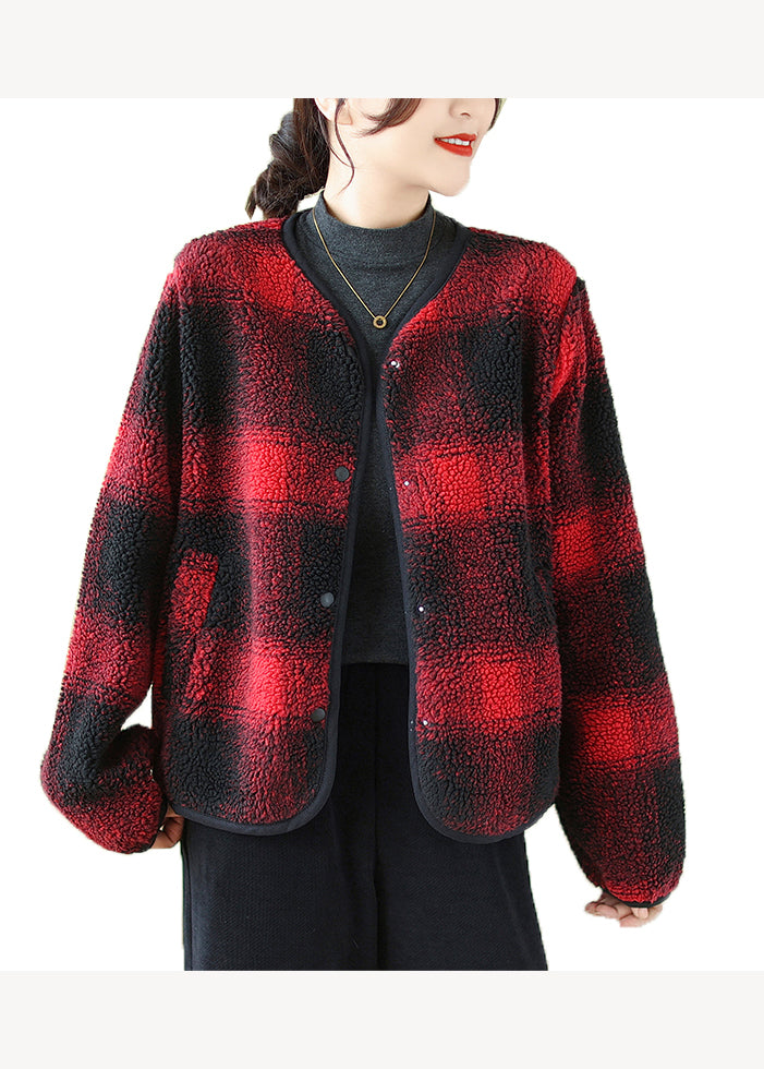 Boutique Red O-Neck Pockets Plaid Faux Fur Jackets Fall