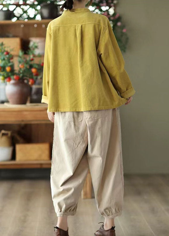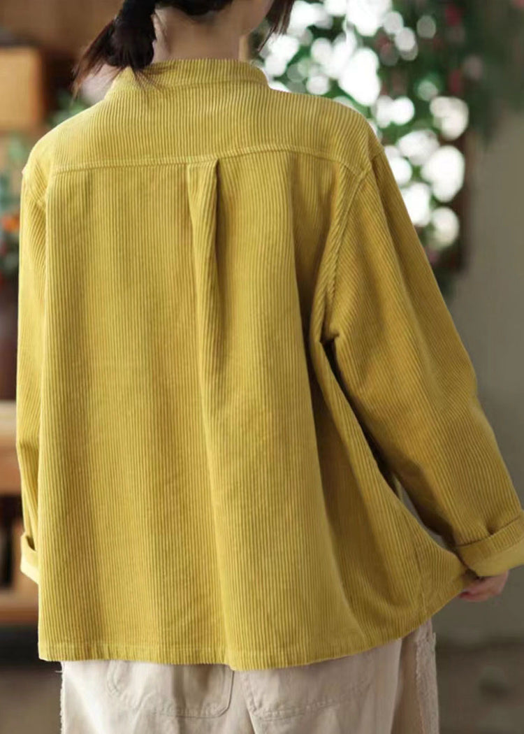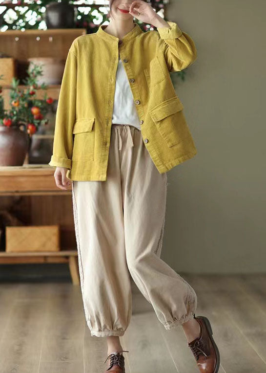 Boutique Yellow Stand Collar Pockets Solid Corduroy Coats Fall