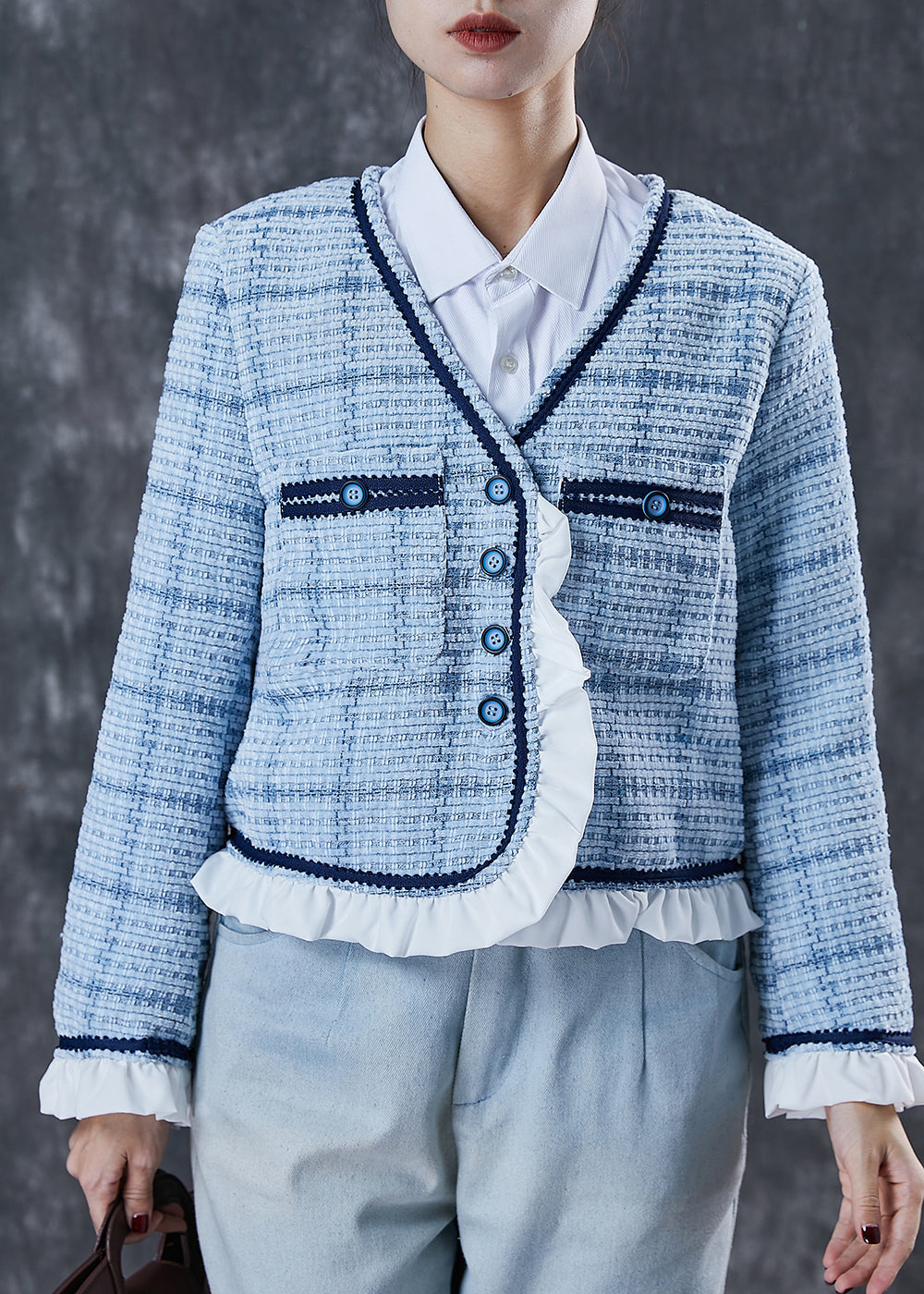 Classy Blue Ruffled Patchwork Cotton Coats Spring