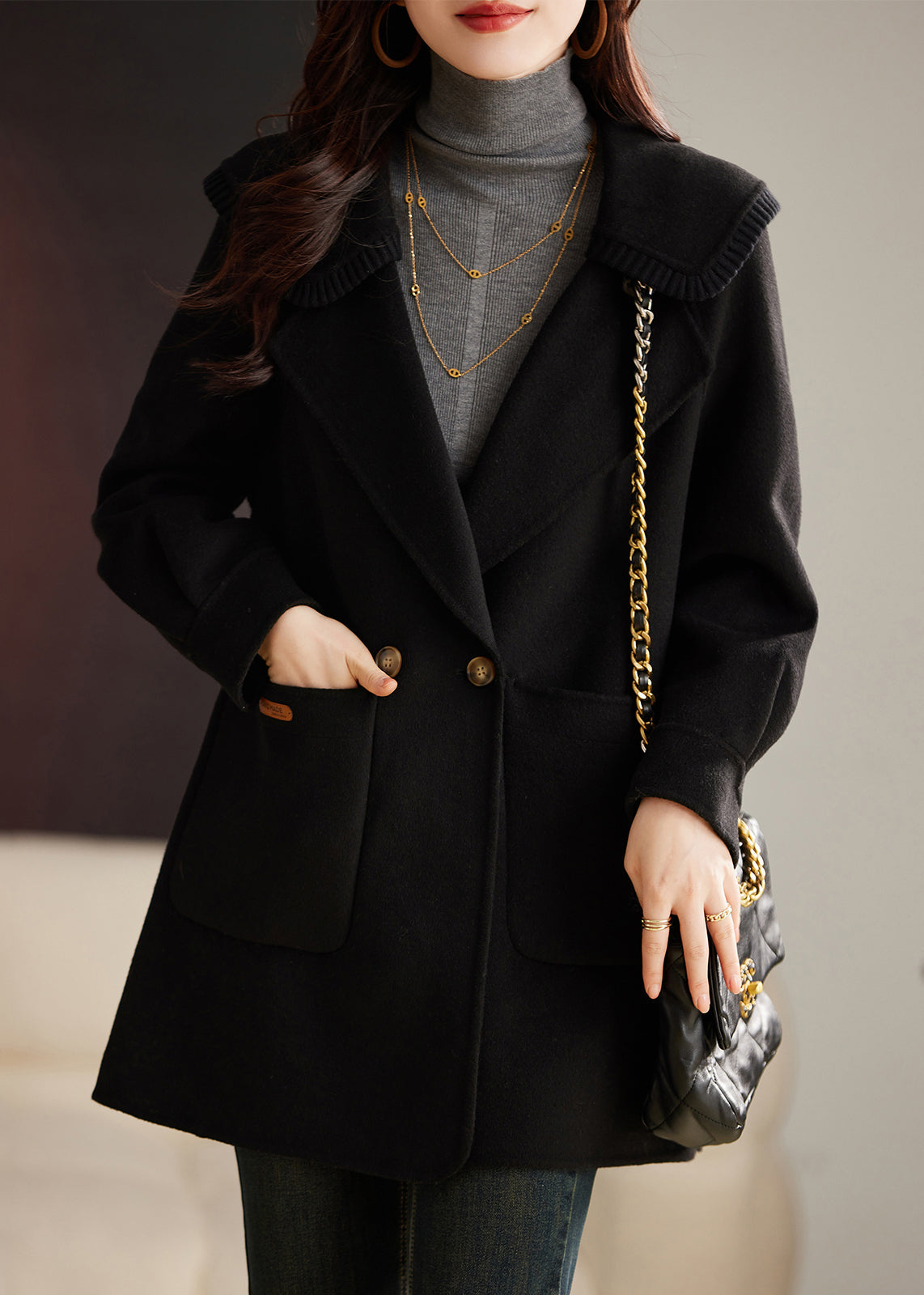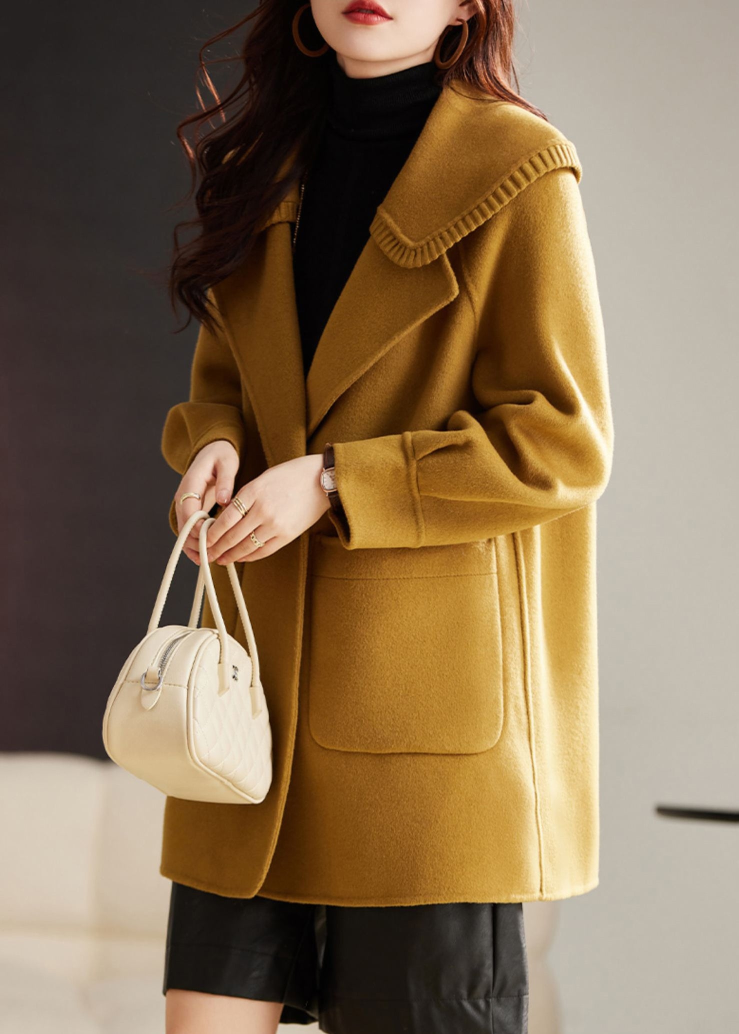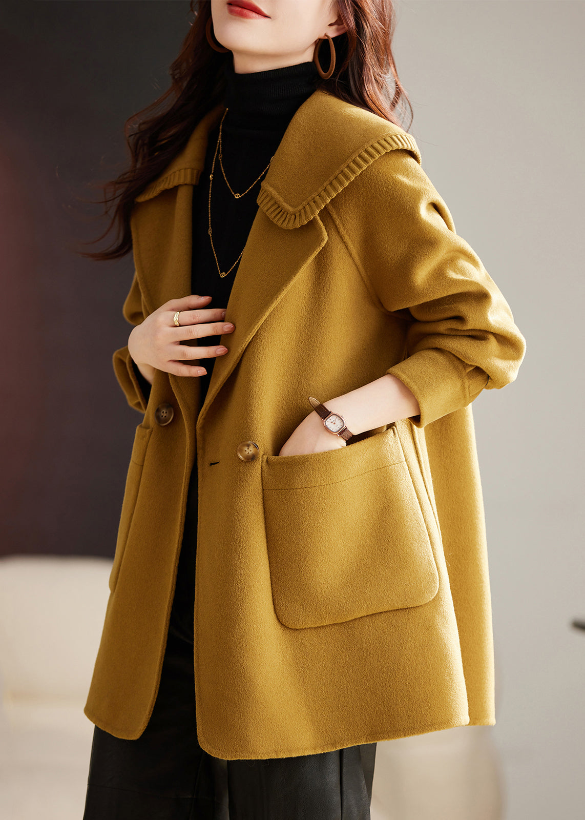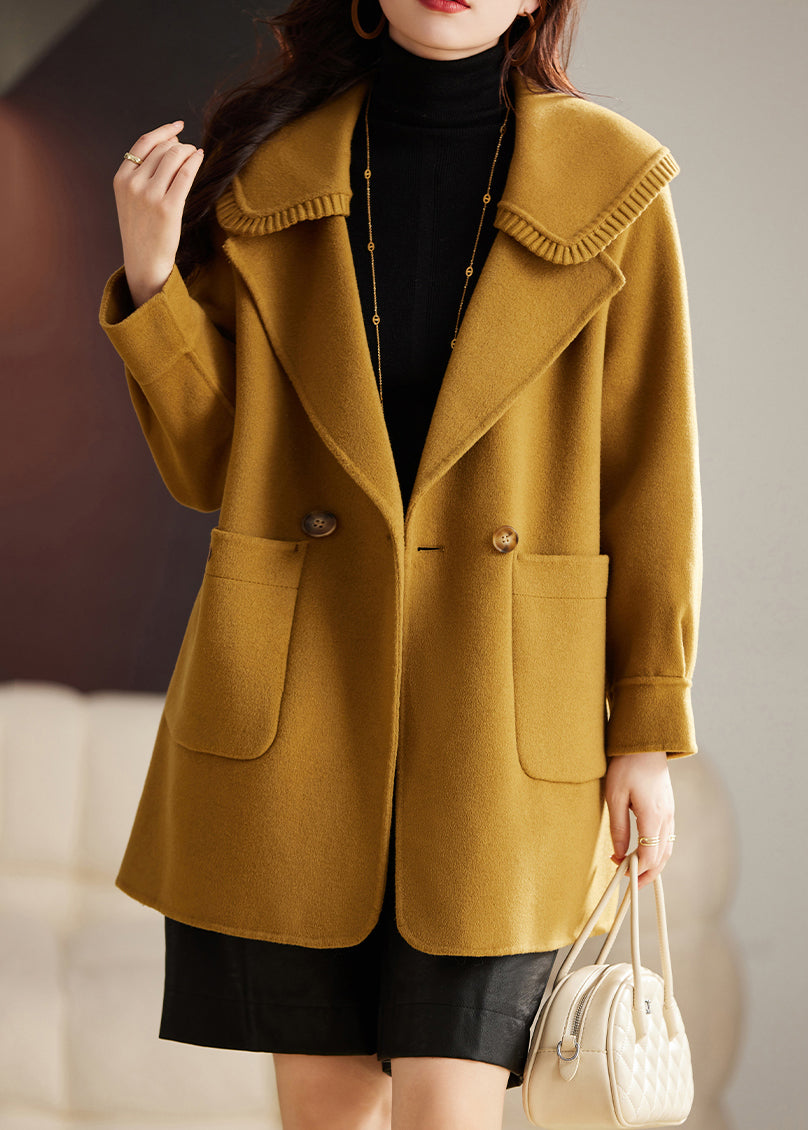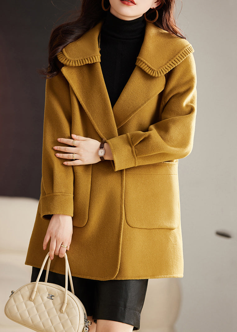 Classy Yellow Button Pockets Patchwork Wool Coat Long Sleeve