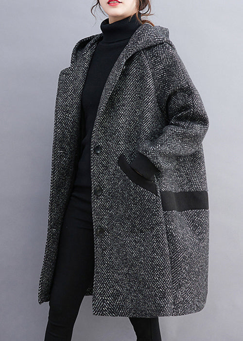 French Grey Hooded Button Pockets Thick Woolen Coats Winter