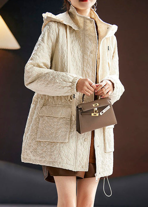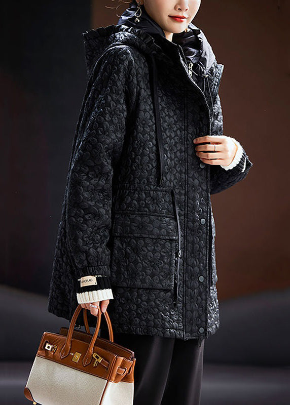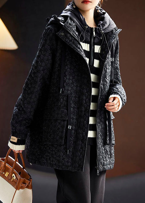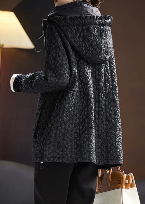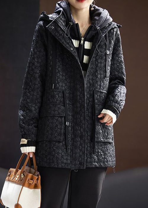 Jacquard Black Hooded Pockets Drawstring Cotton Filled Coats Spring