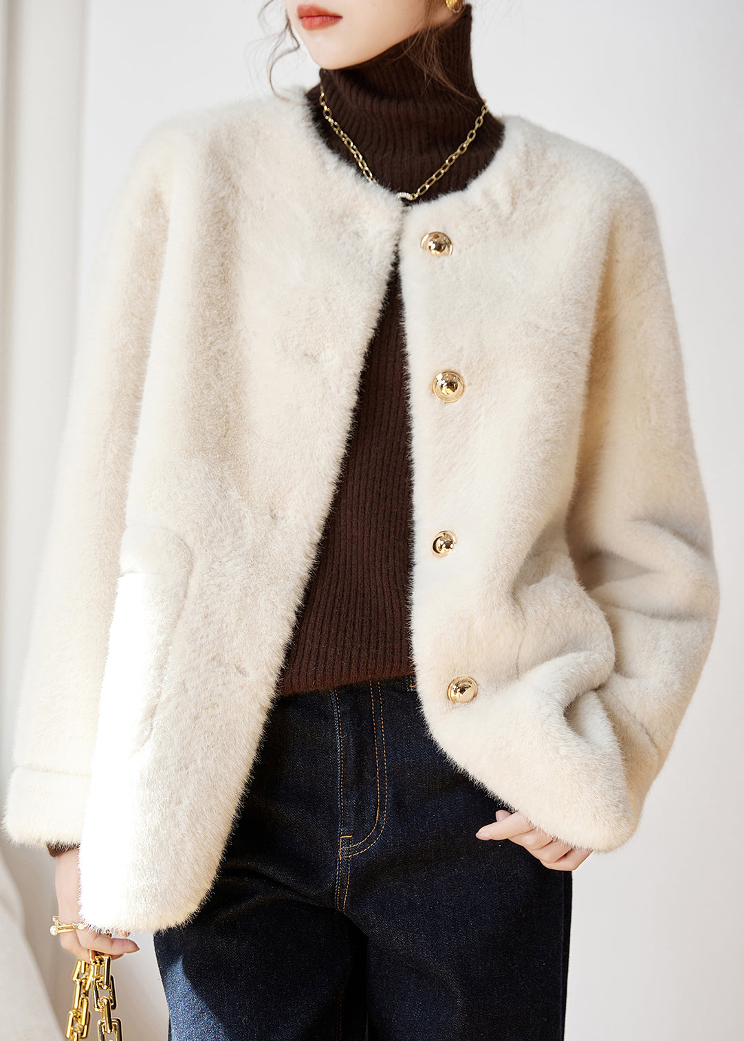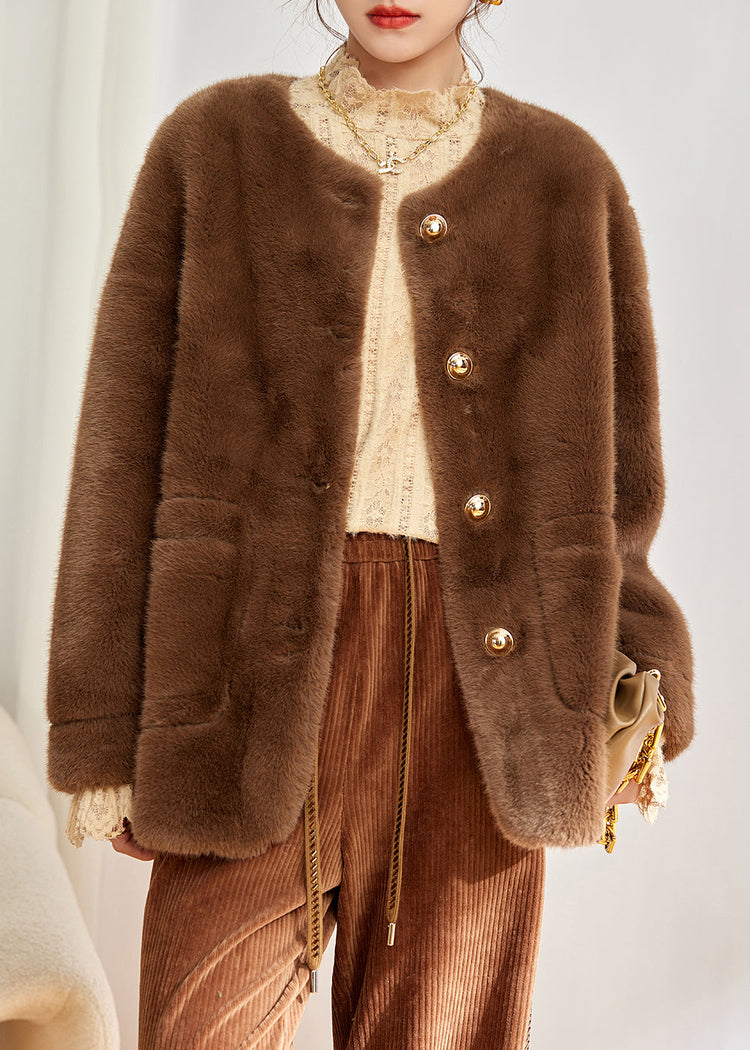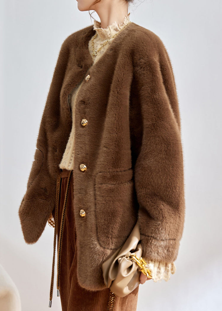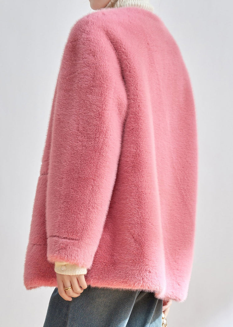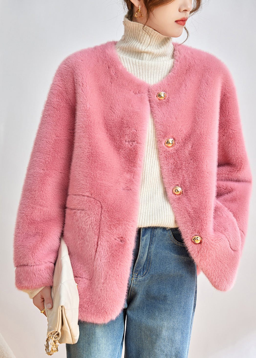 Modern Pink O-Neck Pockets Button Faux Fur Jackets Winter