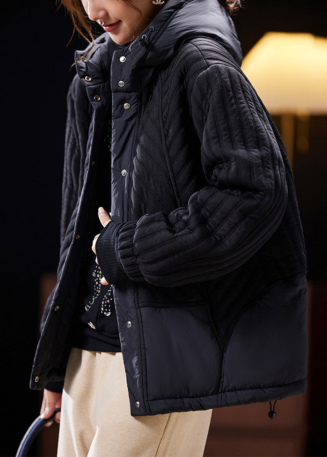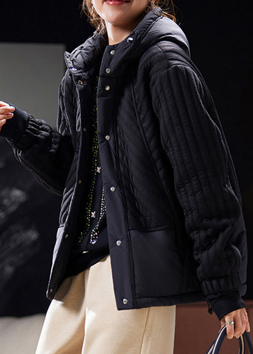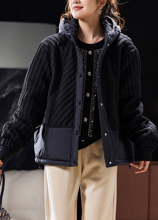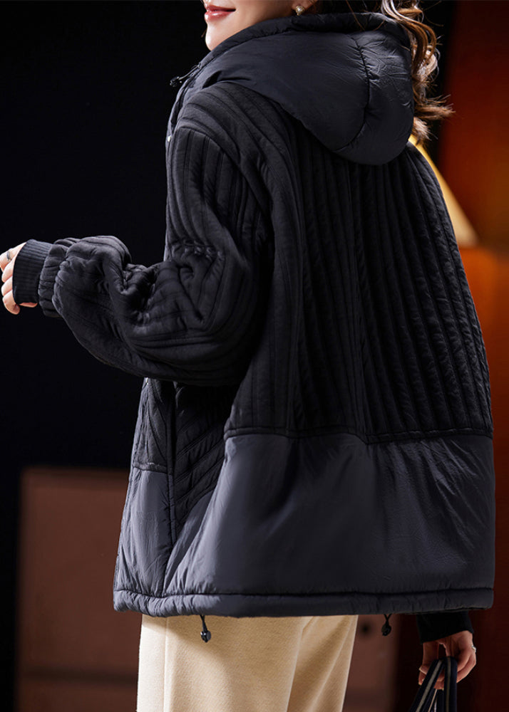 Plus Size Black Hooded Button Cotton Filled Coat Long Sleeve